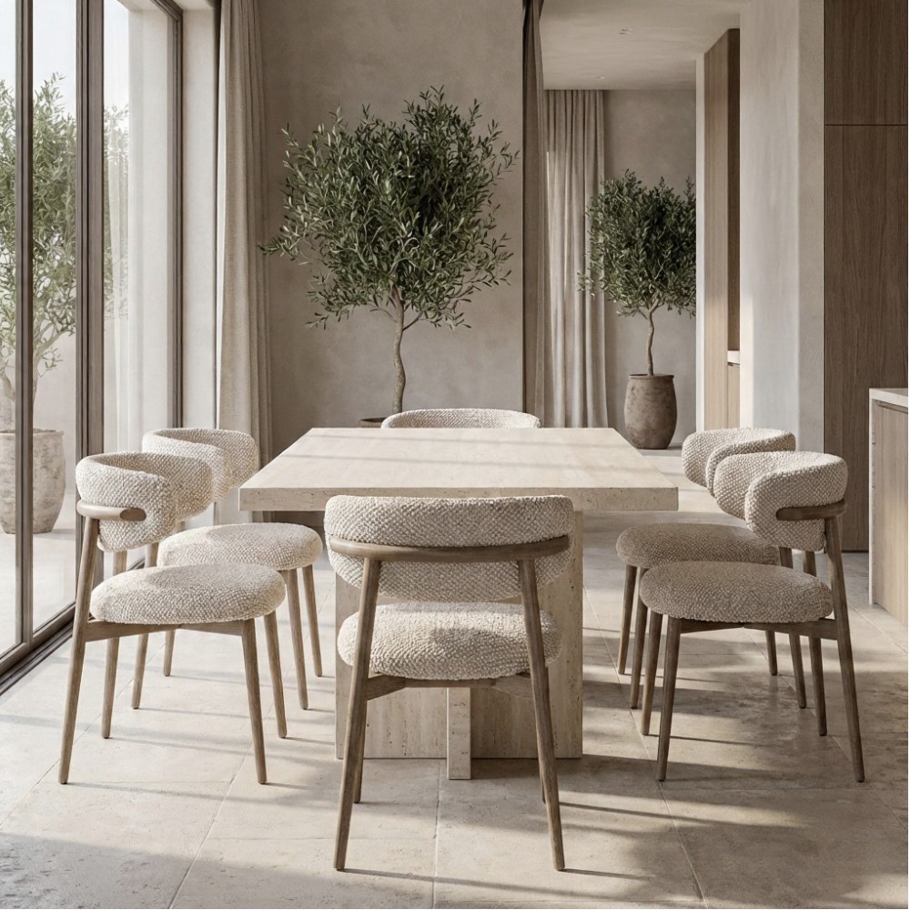 - Fabric upholstery: Durable bouclé fabric that’s easy to care for