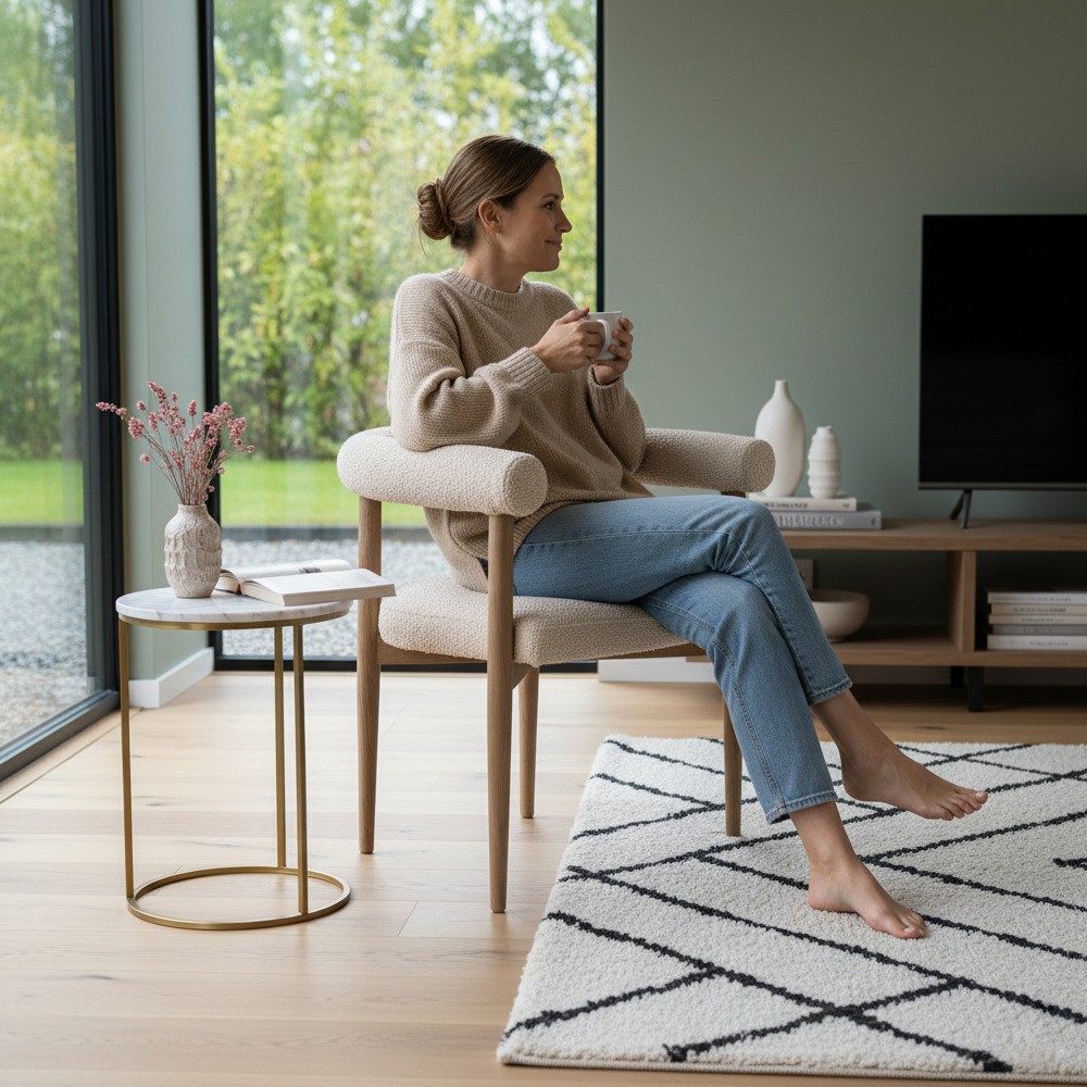 Crafted from ash wood, its structure highlights the beauty of the grain while ensuring long-lasting stability. The textured polyester upholstery offers a rich, tactile feel — elegant yet contemporary. The combination of light wood and neutral fabric creates a natural harmony, making it ideal for a variety of spaces — from dining rooms and home offices to reading corners.