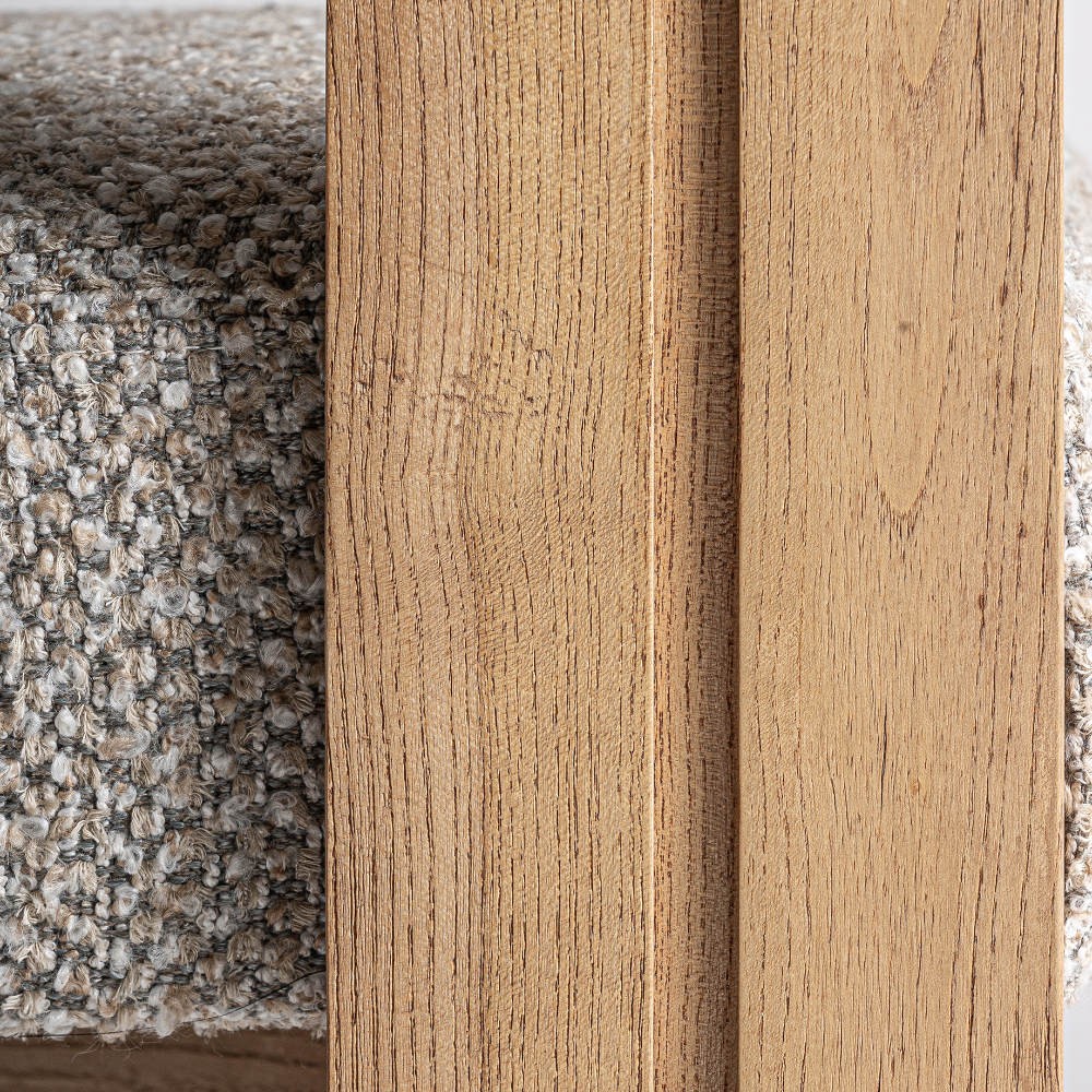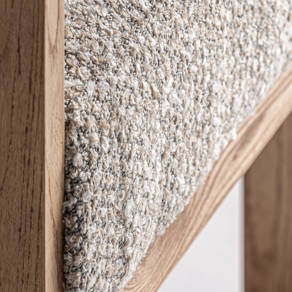 The light oak frame provides strength and authenticity, while the boucle upholstery, woven from a blend of beige and pearl grey threads, offers a calming, textured elegance. The combination of light wood and luminous fabric creates a refined, natural, and contemporary aesthetic.