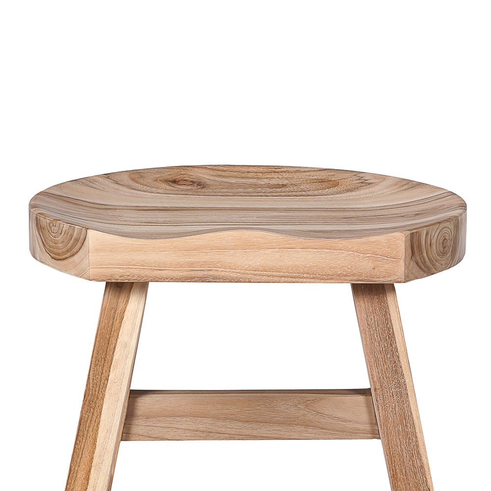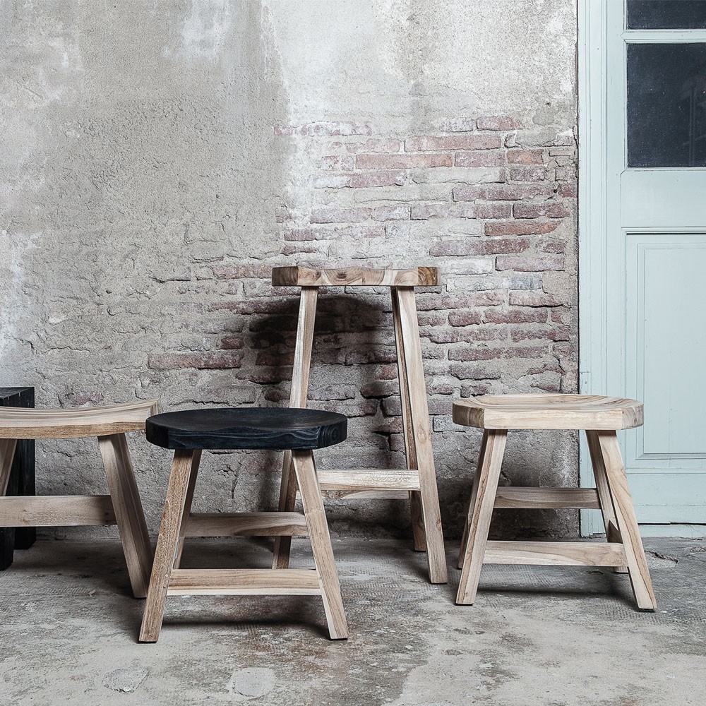 Unique due to its partially rounded shape. The KING stool in natural recycled teak wood is handcrafted from reclaimed wood. Hand crafted and hand finished not mass manufactured. Wood is from demolished old houses, barns, railway sleepers, and any other previously structures. The manufacture of furniture is 100% eco-friendly. Solid and rustic, it will fit perfectly into your interior. Its seat is slightly hollowed out in order to offer you an enveloping and very comfortable seat.