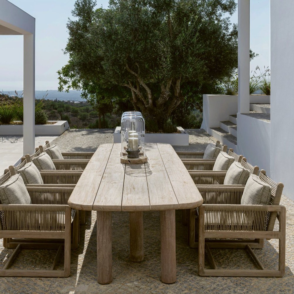Its frame is crafted from reclaimed teak, showcasing the wood’s natural variations and giving each piece a unique character. Strong and built to last, this material is perfectly suited for outdoor use and develops a subtle, attractive patina over time. The woven rope detailing is both graphic and breathable, adding visual lightness while ensuring comfortable seating.