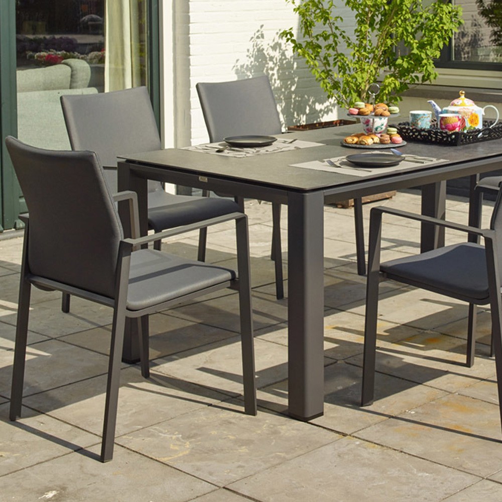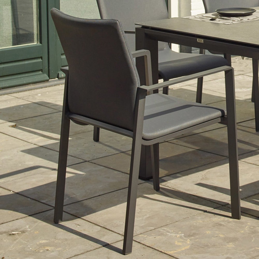 The SENSEE garden chair is timeless. Thanks to its ergonomic shape of the backrest, you sit comfortably on a soft padding. Lightweight, easy to move and stackable, the SENSEE dining chair is no less weatherproof thanks to its textilene fabric and low-maintenance aluminum frame in Lava. This garden chair goes very well with a teak or aluminum garden table.