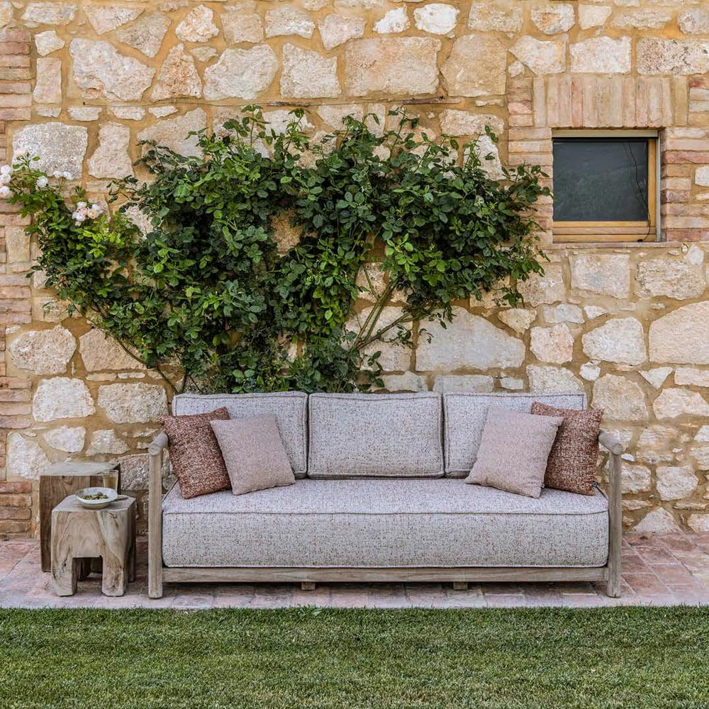 Immerse yourself in the captivating authenticity of the MONA garden sofa in natural grey reclaimed teak, where natural elegance blends with an unparalleled comfort experience.