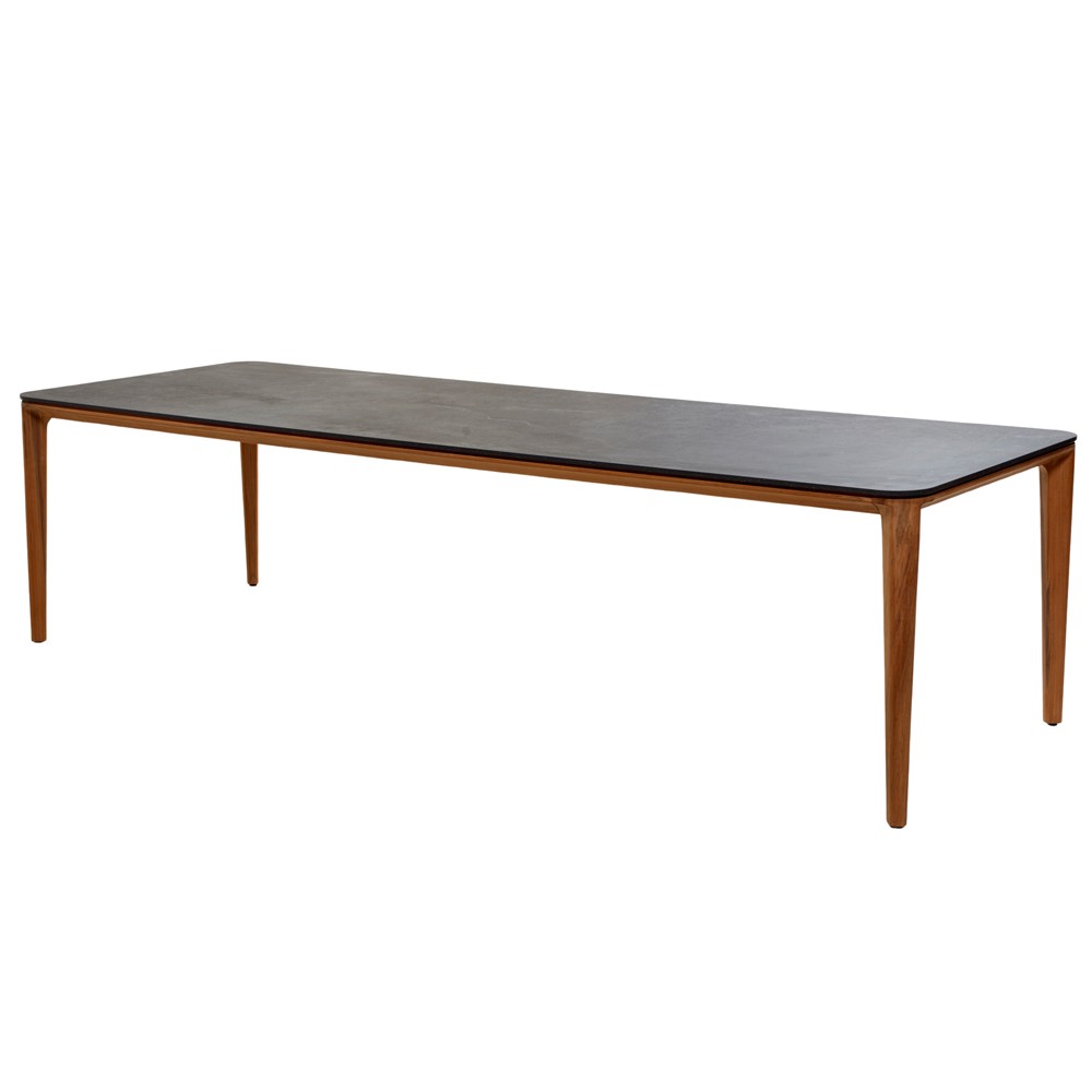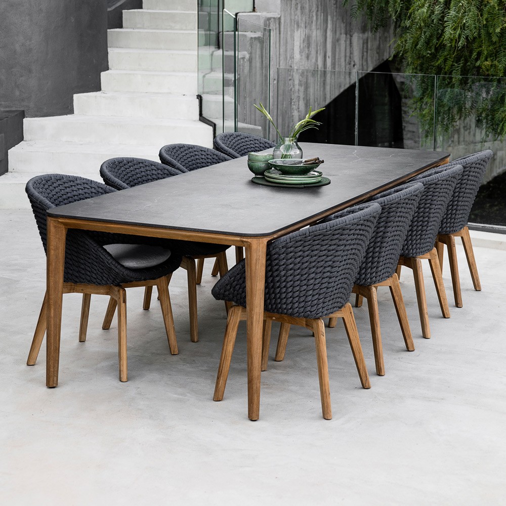 The base of the table is teak, sourced and cultivated according to the SVLK certified system. The solid ceramic table top rests on an aluminium core, cleverly concealed beneath it. Strong and resistant, this table is designed to last outside all year long. The table can easily accommodate 8 to 10 people, depending on the chosen seating configuration.
