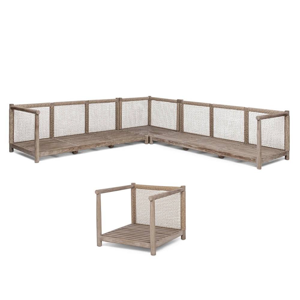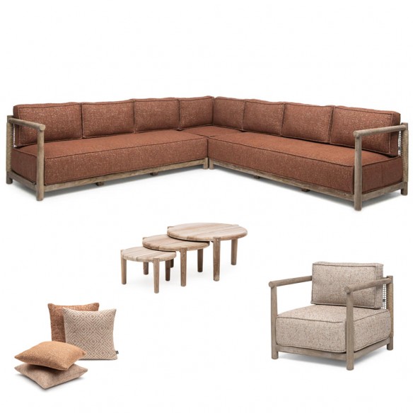Settle in for a relaxing time outdoors with the MONA garden furniture set. This stylish and comfortable set is made from recycled teak, a durable and weather-resistant material. It includes a large L-shaped sofa, an armchair, and a trio of coffee tables.