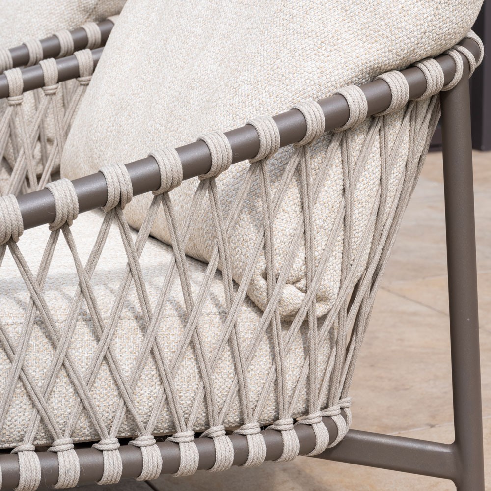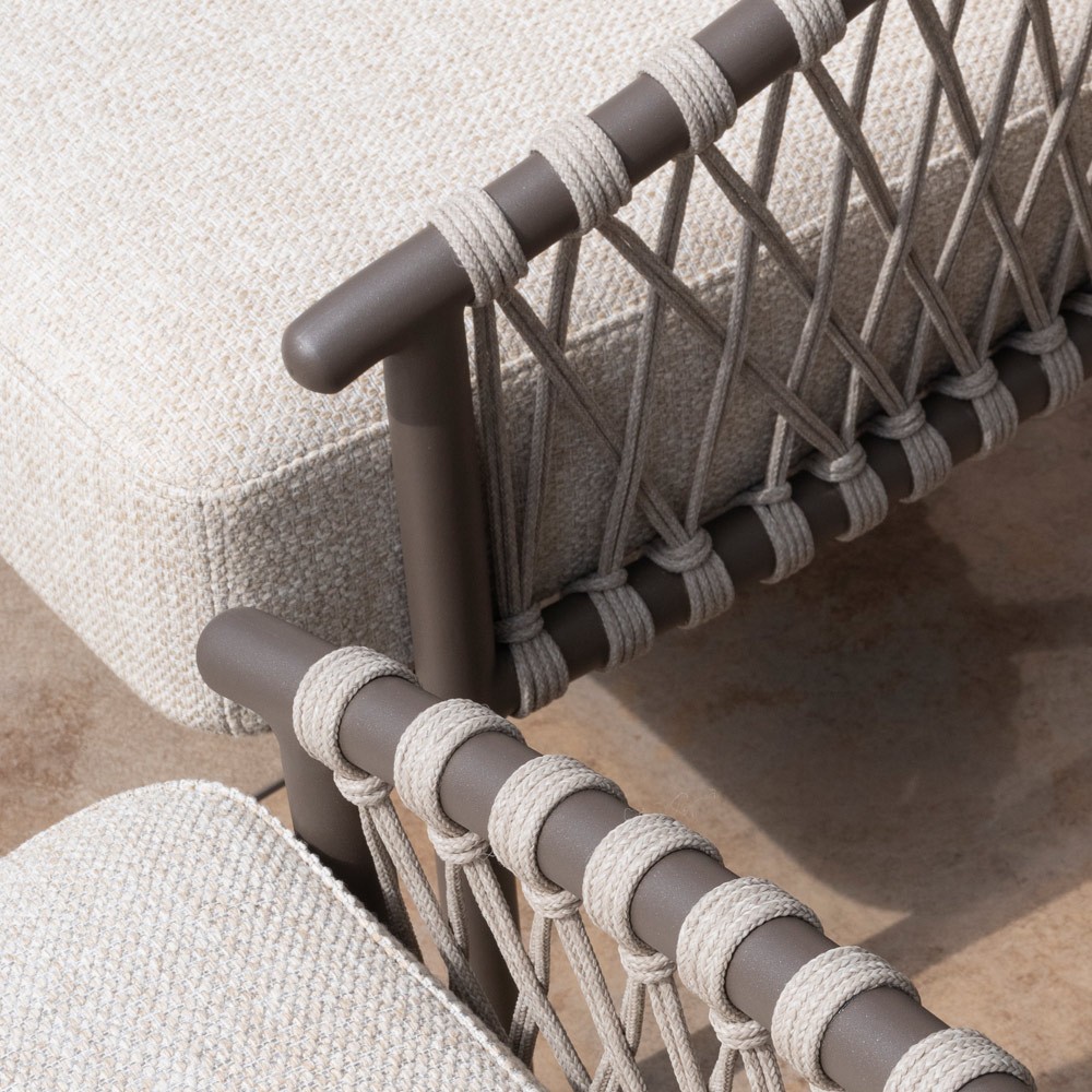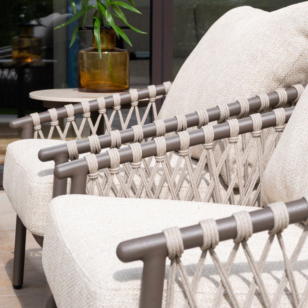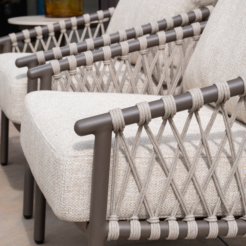 The timeless taupe aluminium frame is paired with a subtle, contemporary weave for a truly refined look. Plush cushions in natural tones add a soft, inviting touch, completing the harmonious aesthetic. Perfectly suited for hosting in style, this 5-seater set elevates any outdoor gathering.