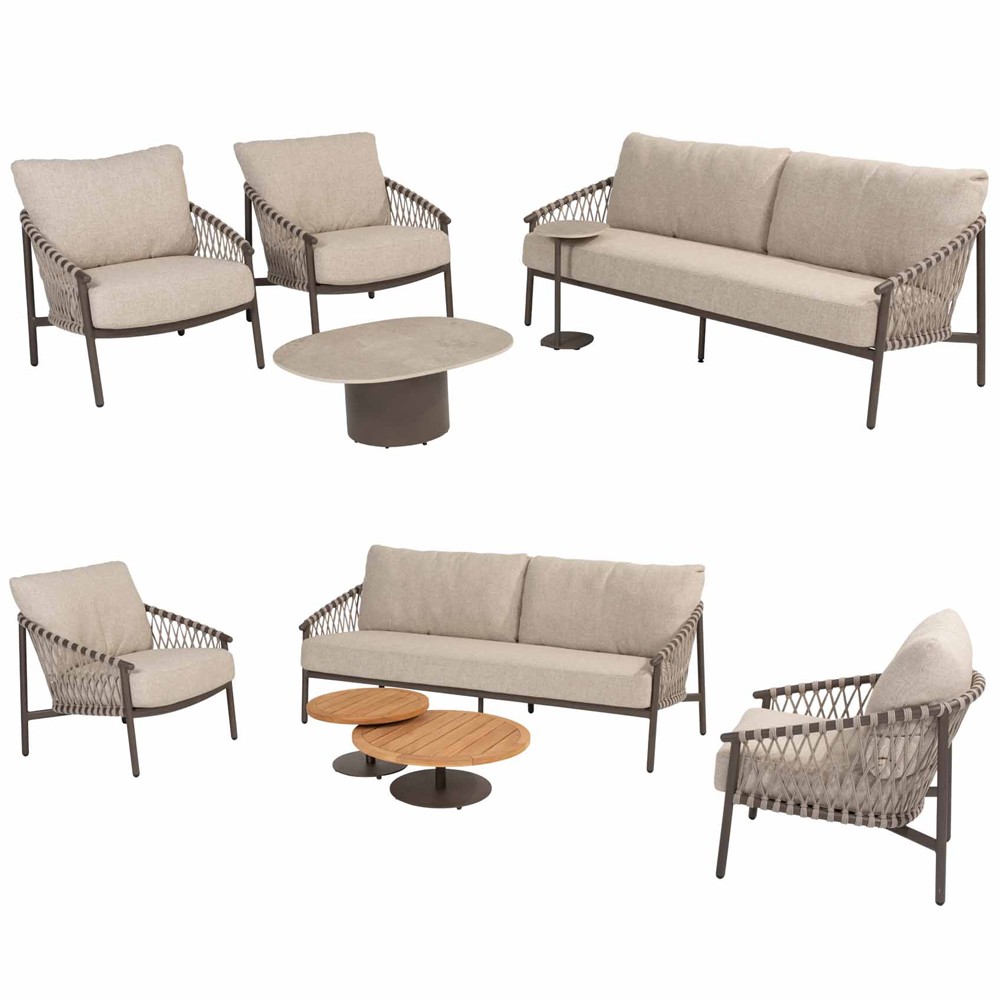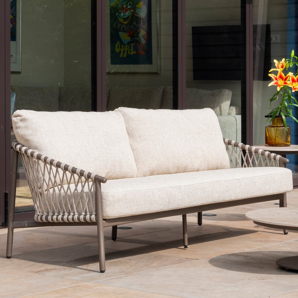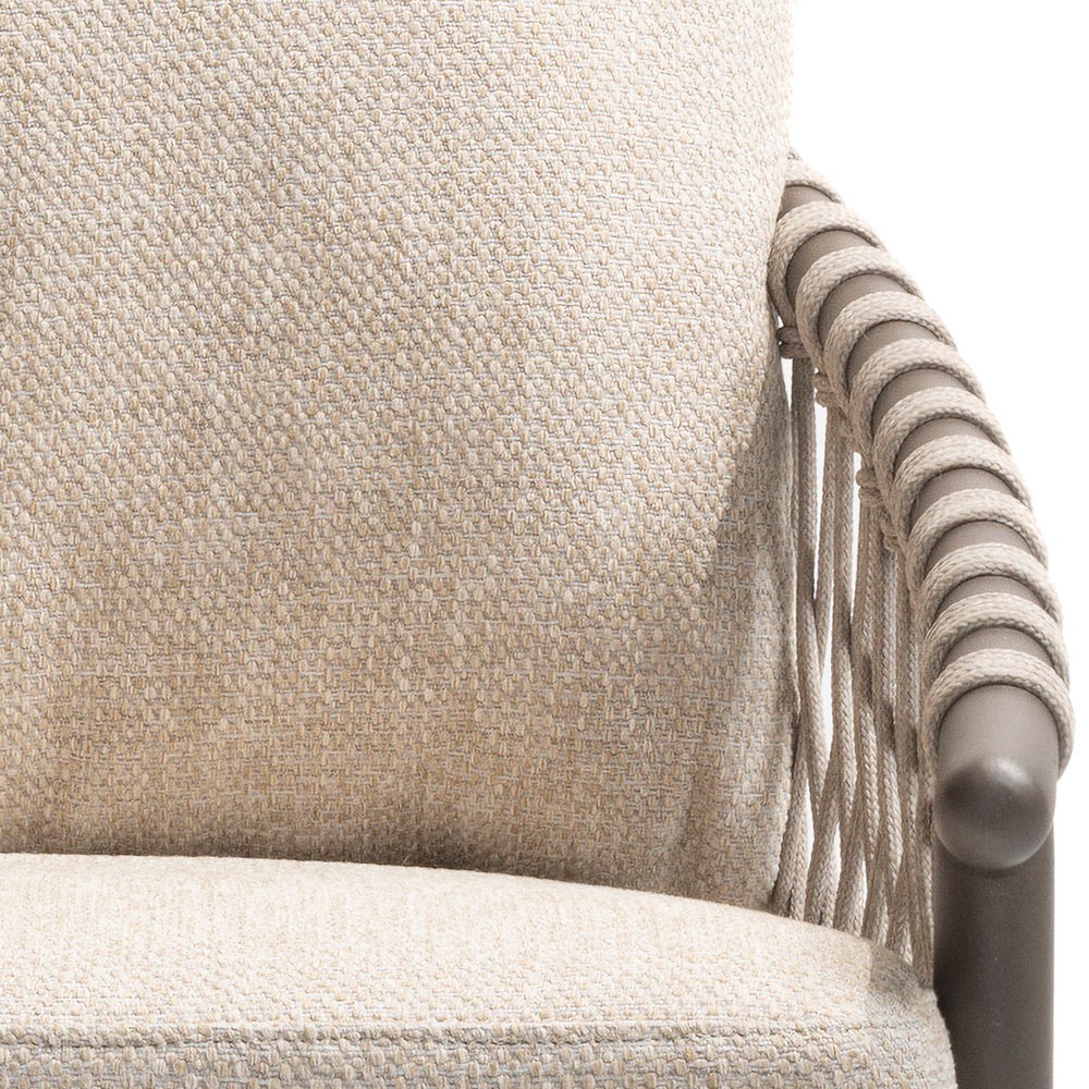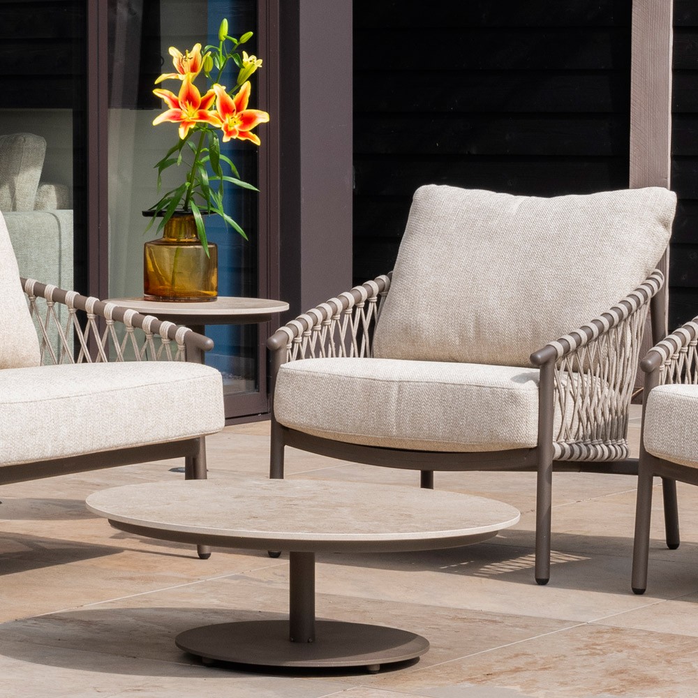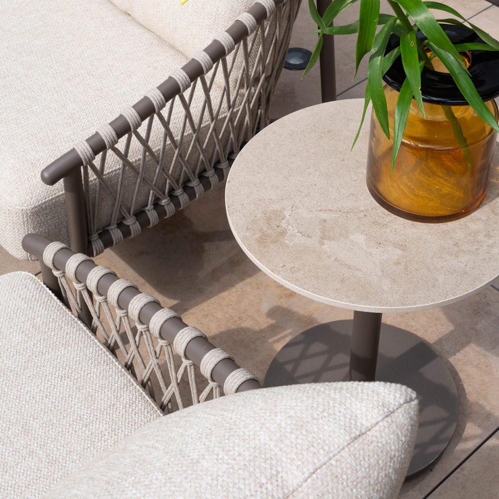 The timeless taupe aluminium frame is paired with a subtle, contemporary weave for a truly refined look. Plush cushions in natural tones add a soft, inviting touch, completing the harmonious aesthetic. Perfectly suited for hosting in style, this 5-seater set elevates any outdoor gathering.