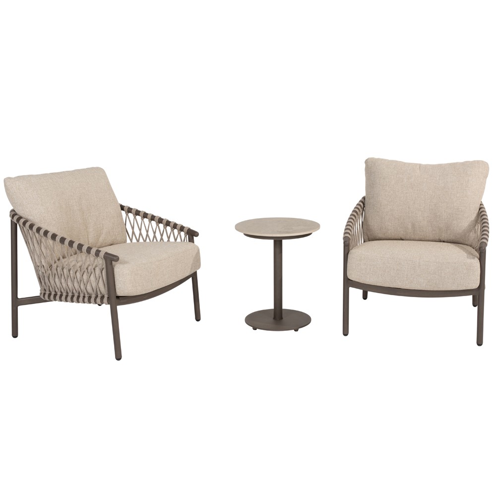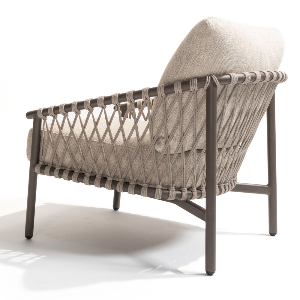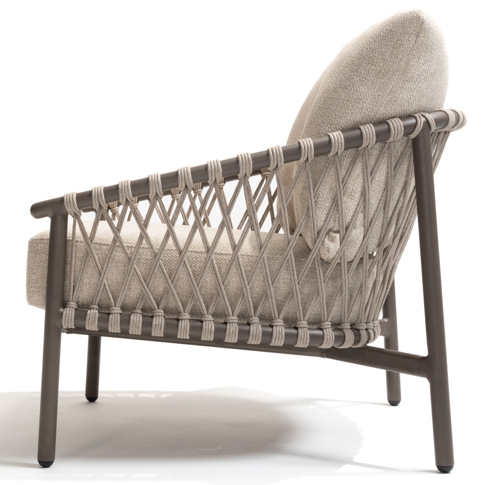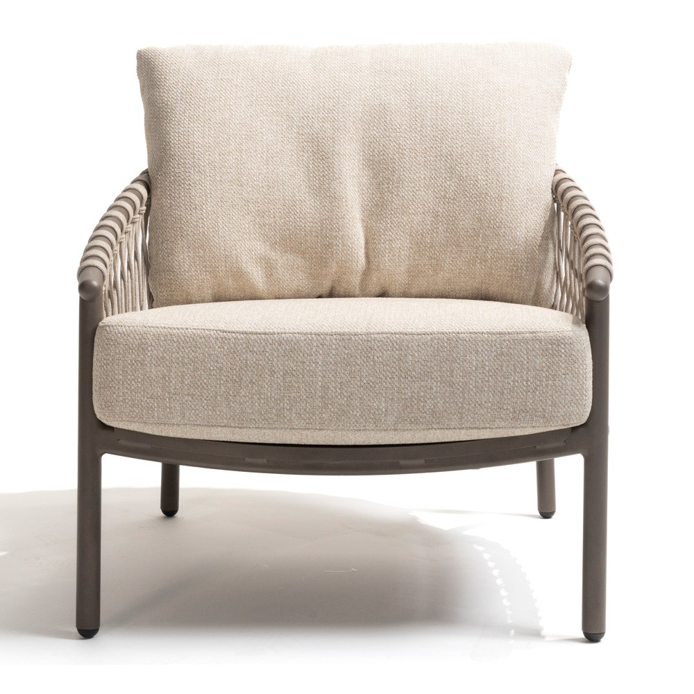 The timeless taupe aluminium frame is paired with a subtle, contemporary weave for a truly refined look. Plush cushions in natural tones add a soft, inviting touch, completing the harmonious aesthetic. Perfectly suited for hosting in style, this 5-seater set elevates any outdoor gathering.