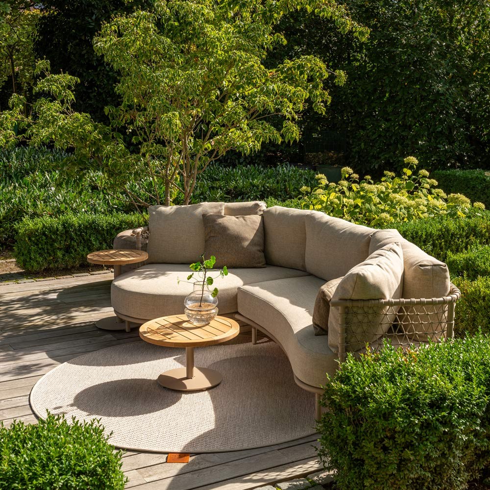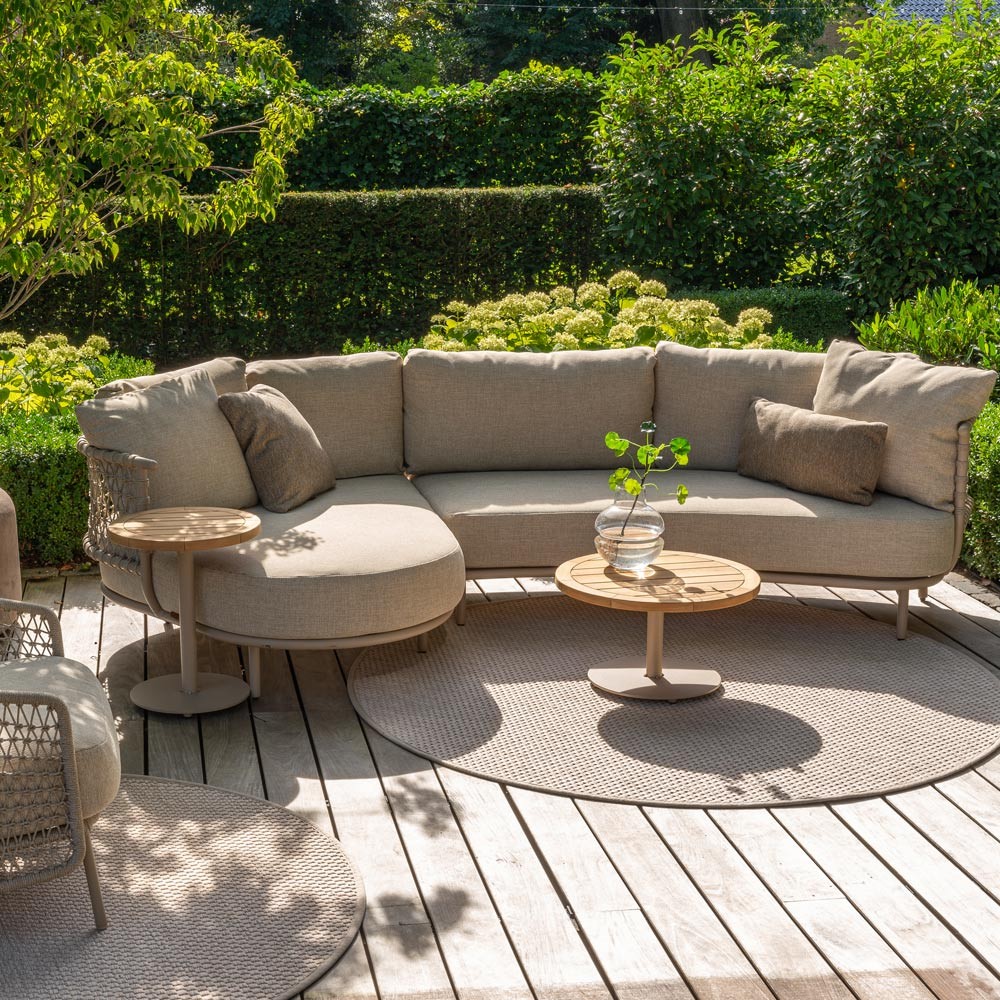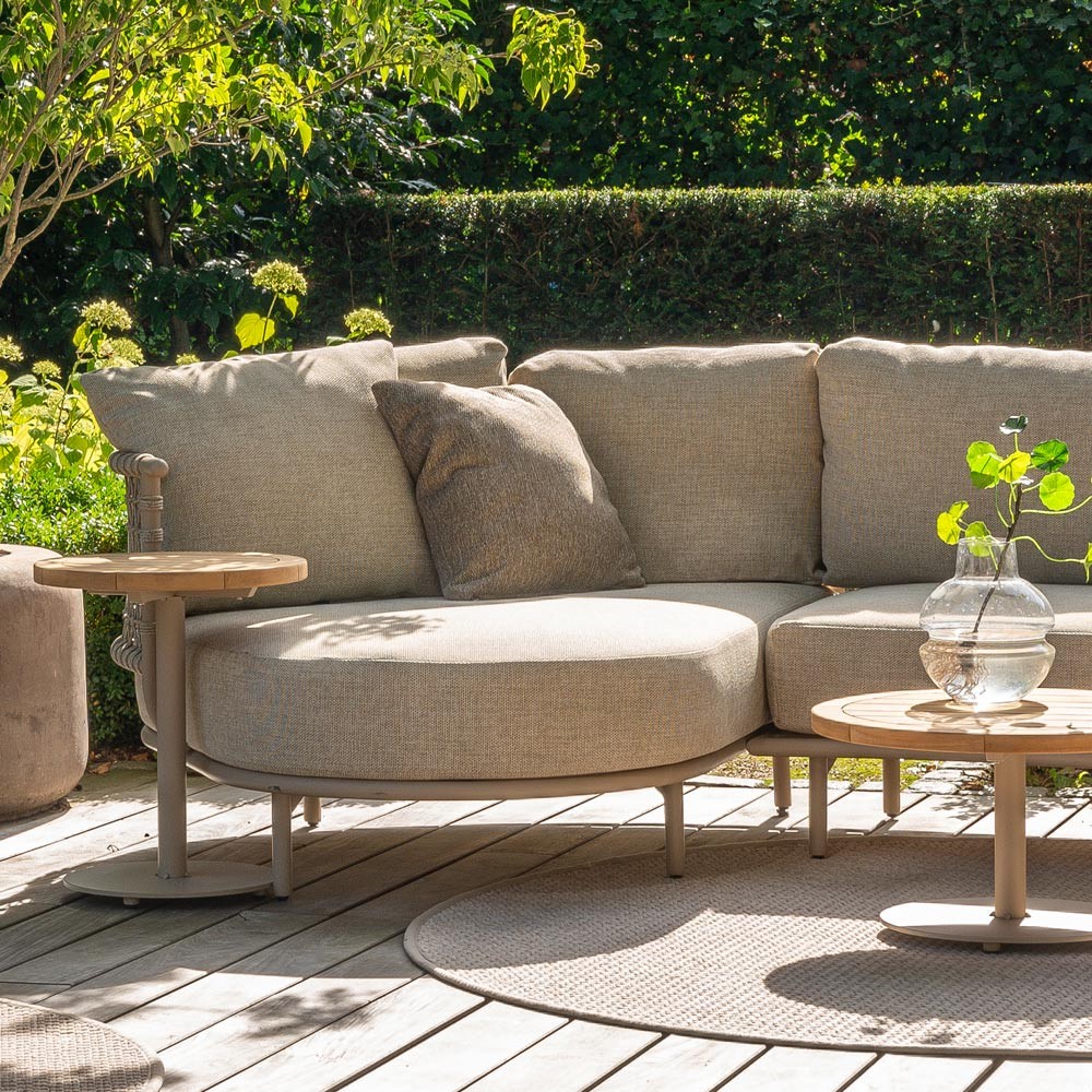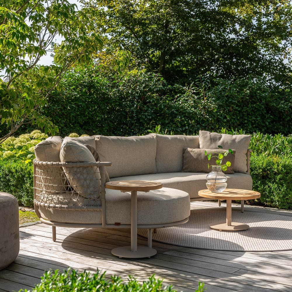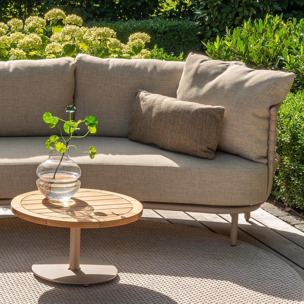 The lounge set comes with a round coffee table and side table, featuring teak tops and aluminium frames. These stylish additions harmonise with the overall look and provide the perfect surface for drinks, books or decorative objects.