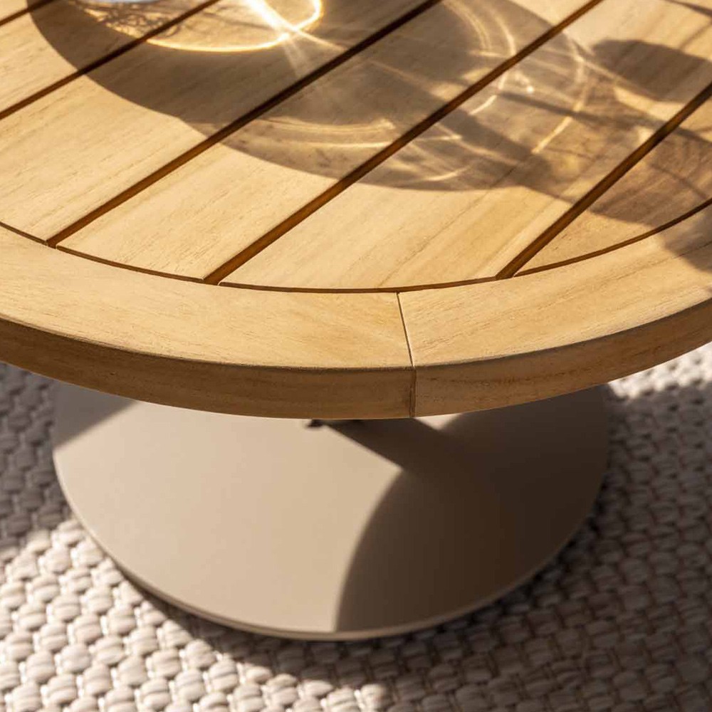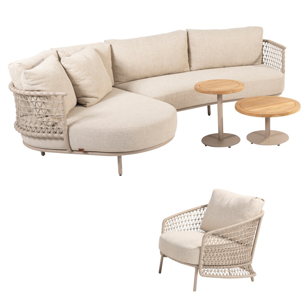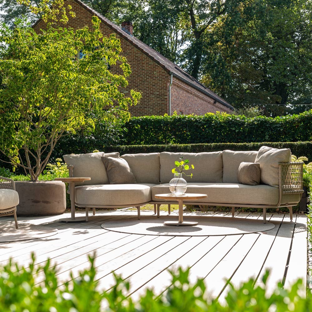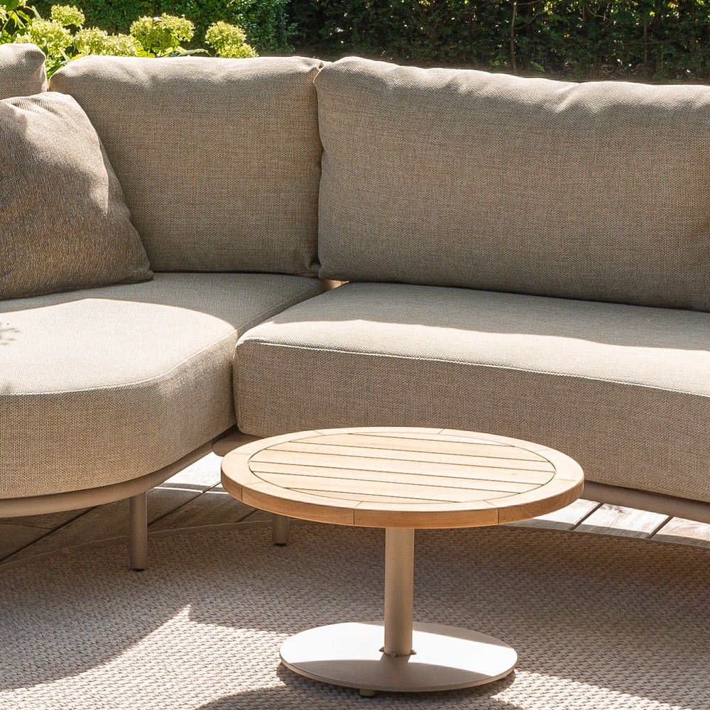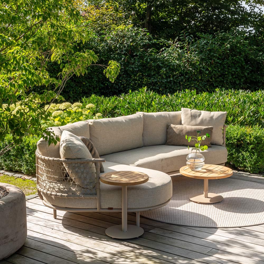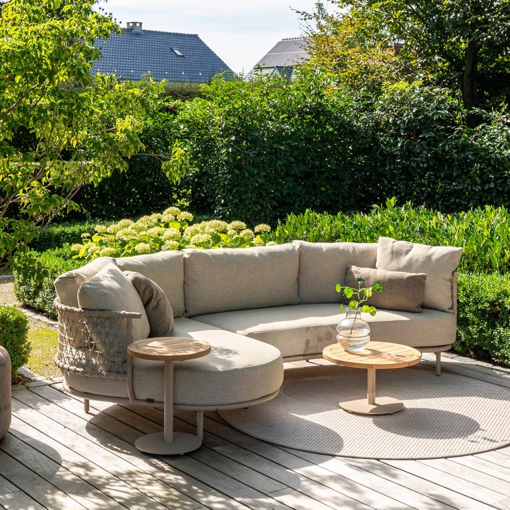 The lounge set comes with a round coffee table and side table, featuring teak tops and aluminium frames. These stylish additions harmonise with the overall look and provide the perfect surface for drinks, books or decorative objects.