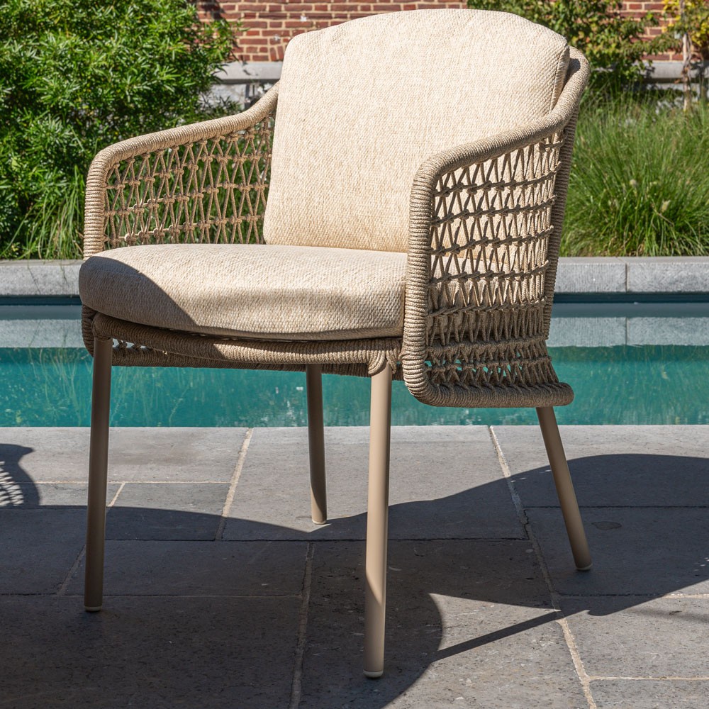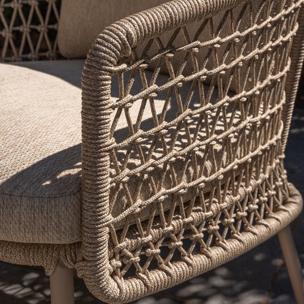 The PALOMA chairs, with their stainless aluminium frames finished in a calming sand beige tone, complement the set beautifully. Their carefully handwoven rope detailing, in a soft beige palette, adds a natural and authentic touch. Each chair comes with thick cushions covered in olefin fabric—a soft, breathable, and UV-resistant material that offers exceptional seating comfort. Designed for outdoor use, these chairs are sturdy, fully weatherproof, and easy to maintain.