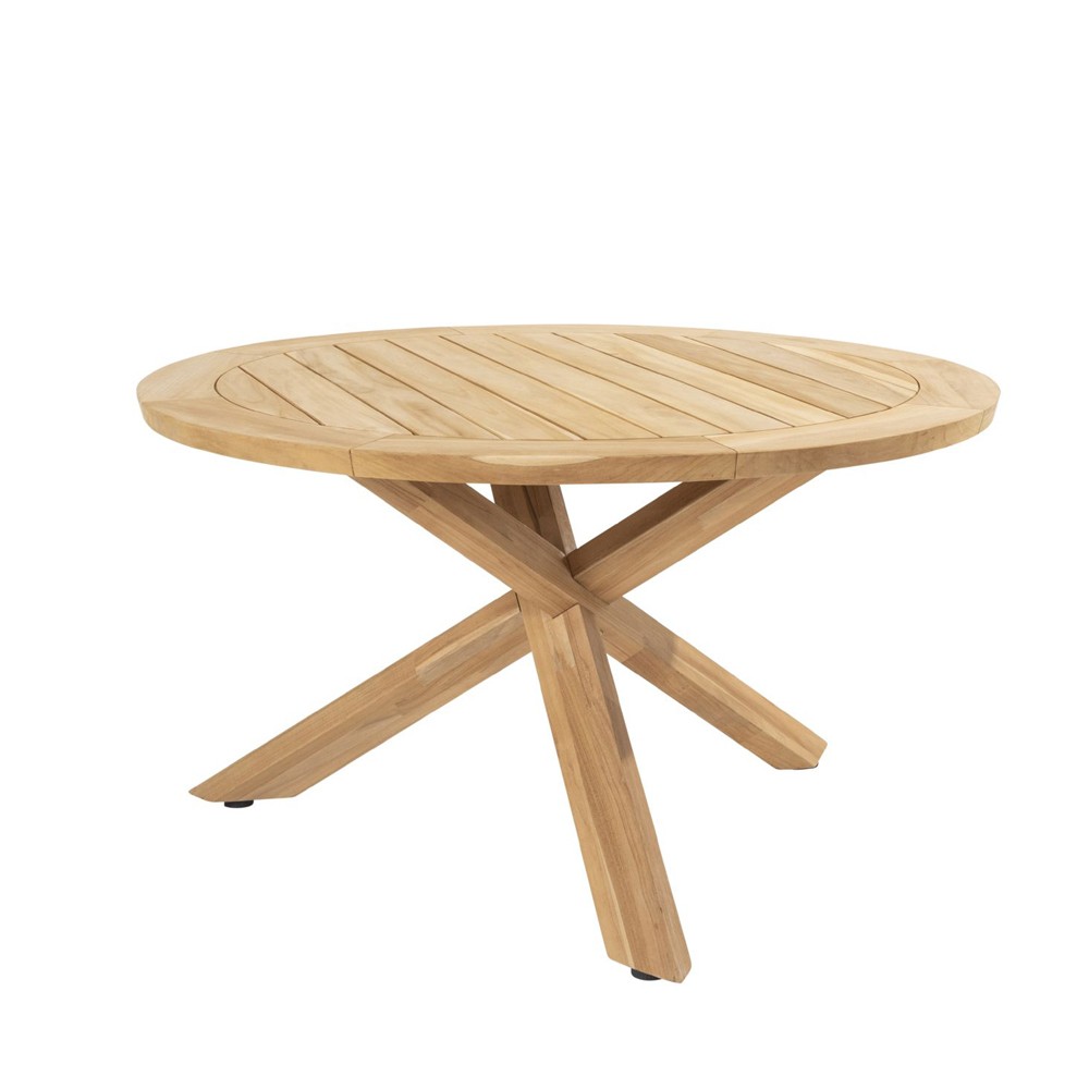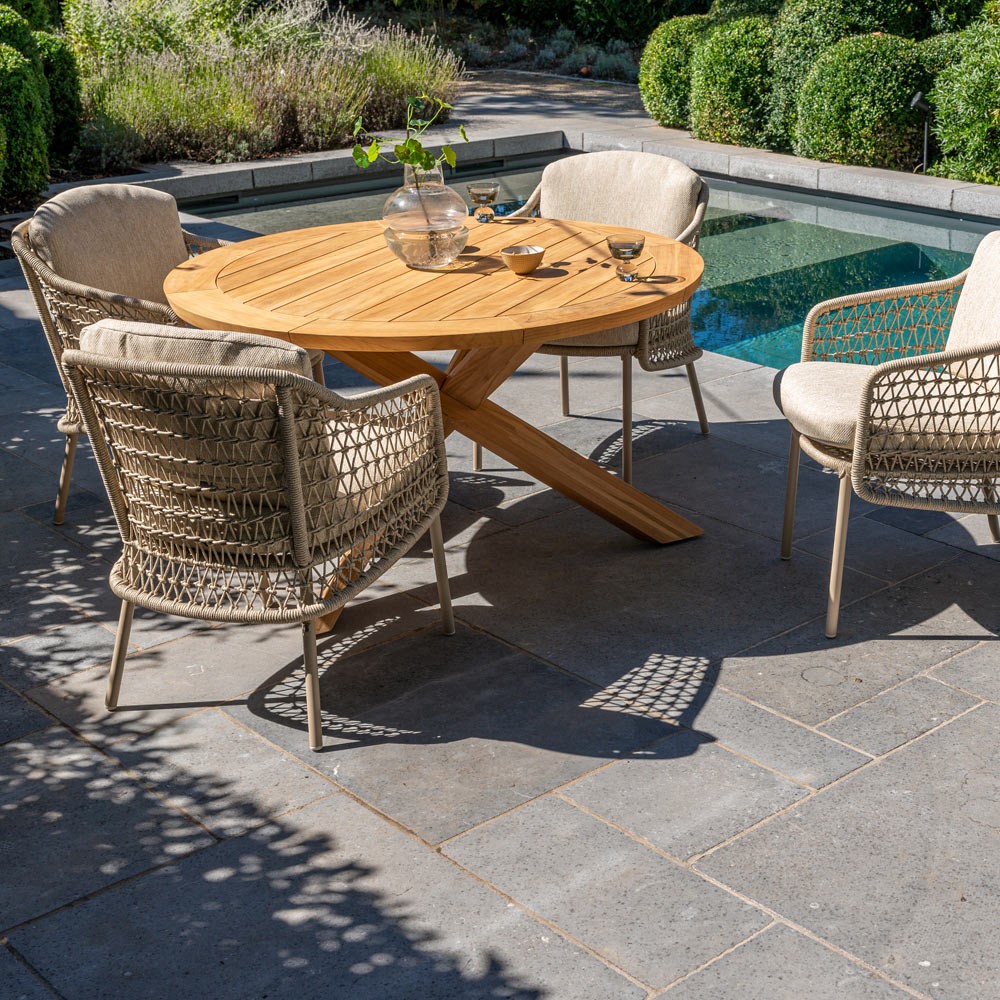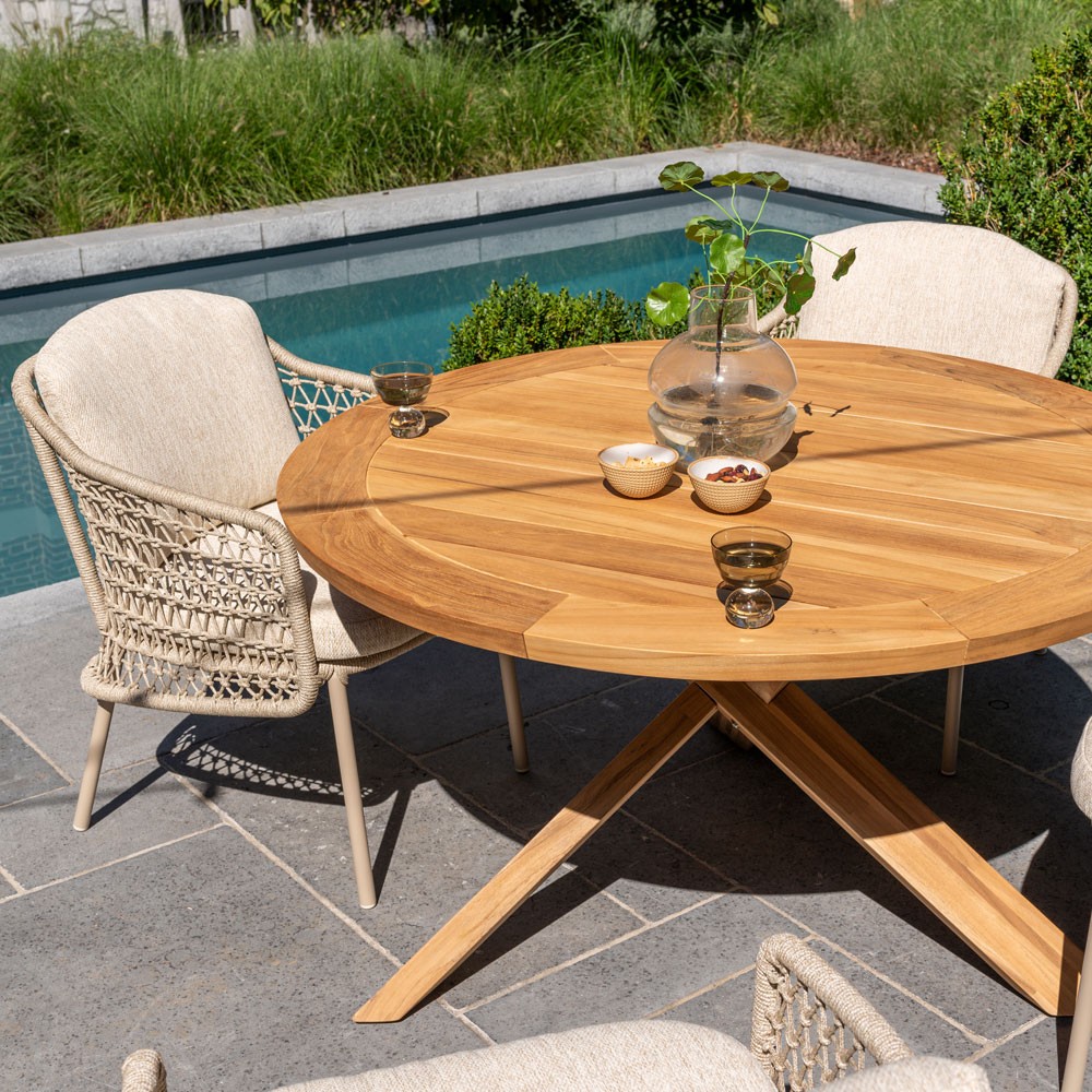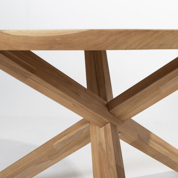 The PETRA table impresses with its 130 cm diameter teak top, ideal for social meals in the open air. Its 4 cm thickness and geometric crossed base give it a modern aesthetic and exceptional strength. With its timeless natural charm, it effortlessly complements any outdoor décor style.