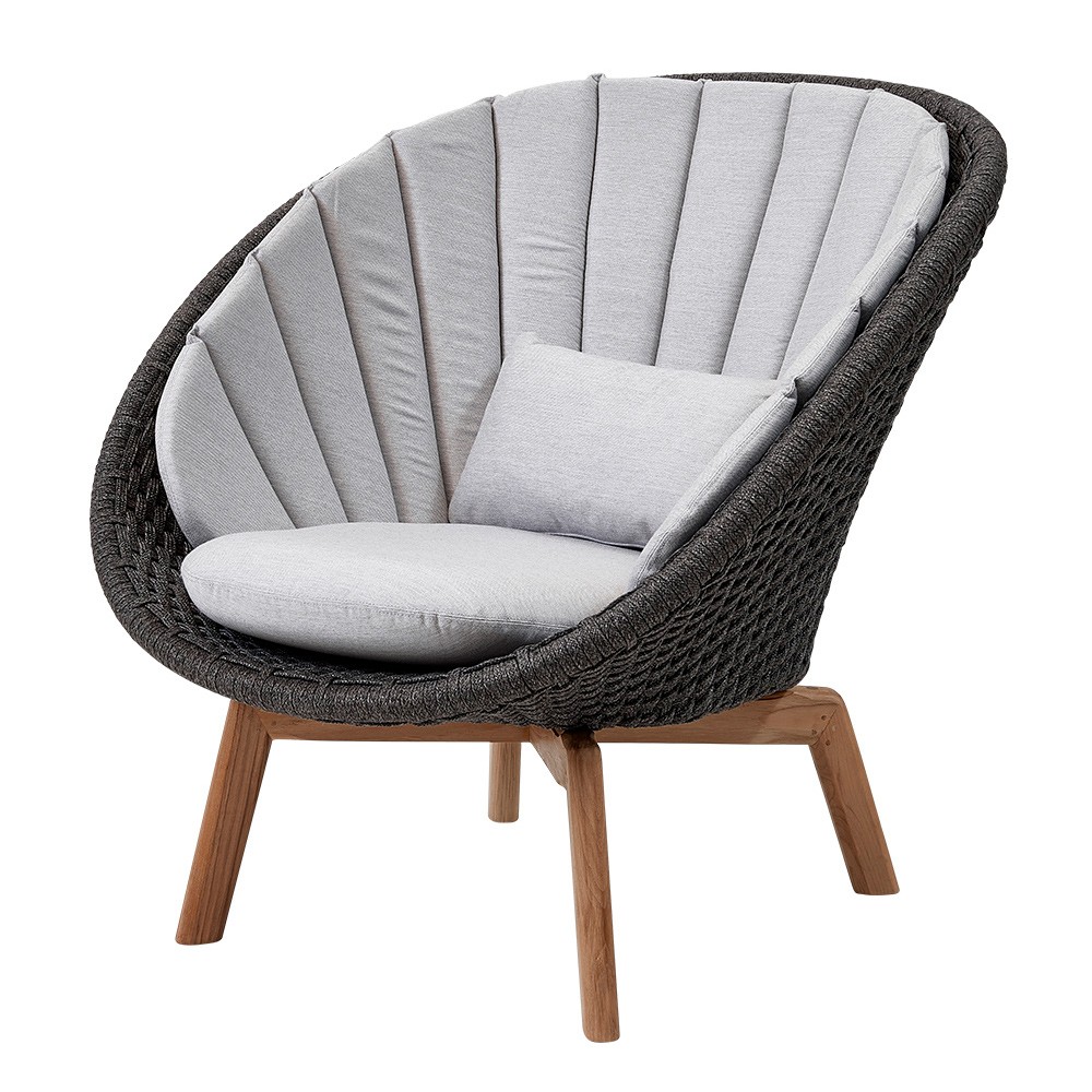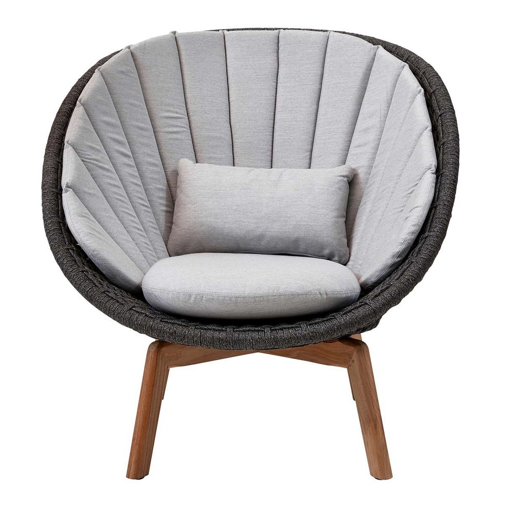 Hardwood Teak, four legged base. The Peacock Soft Rope comes in Dark grey or light Grey. As well as, a Natte Fabric seat and backrest cushion set in Light Grey, Grey or Taupe.