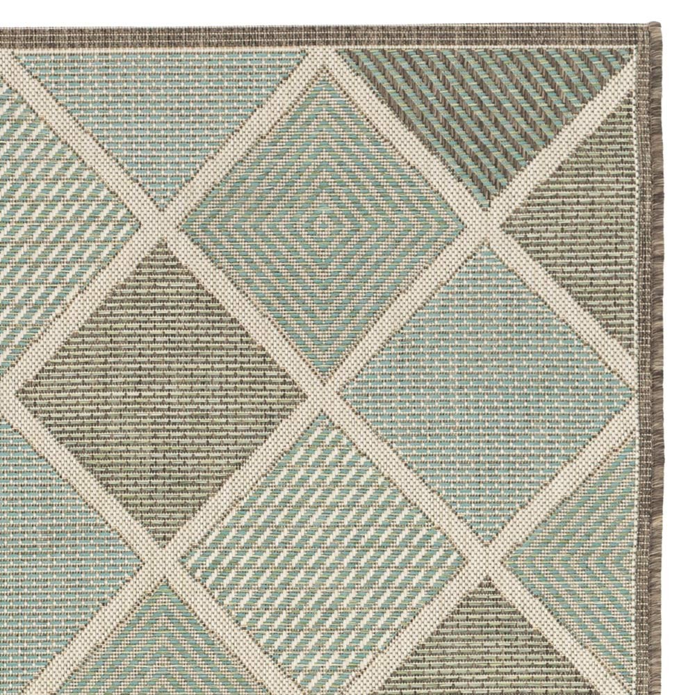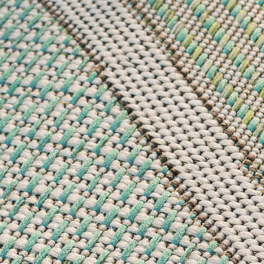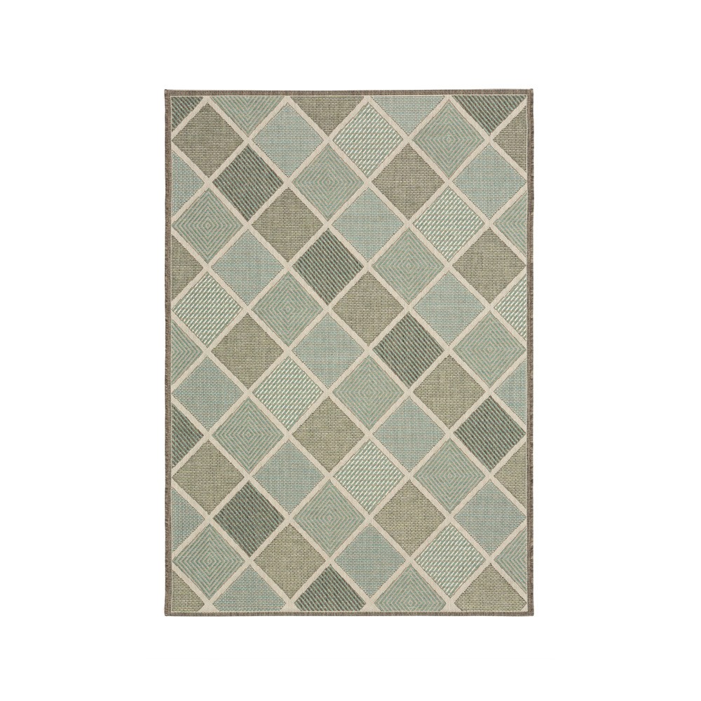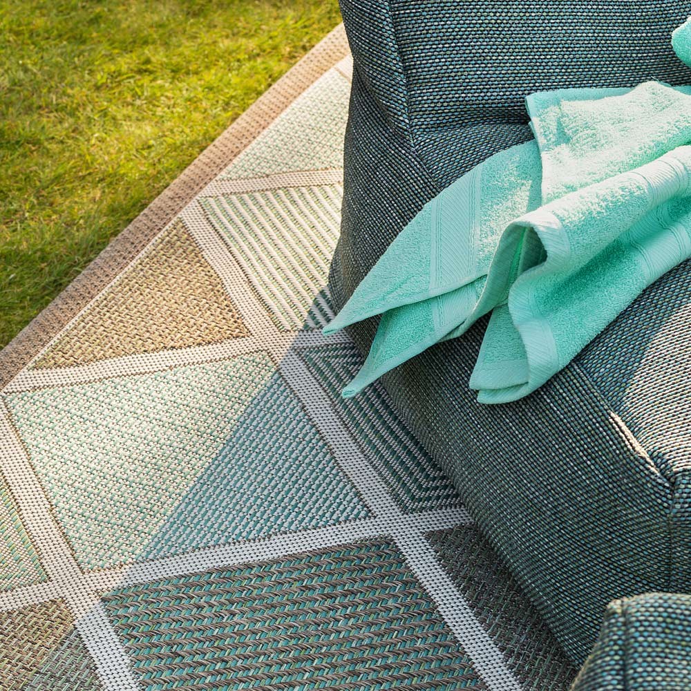 Add an artistic touch to your living space with this stunning Meridian rug. Its diamond-shaped pattern is adorned with a subtle mix of textures in turquoise and natural colours. Made from polypropylene fibre, this resistant and durable rug is a must-have addition to your favourite casual space, whether it is indoors or outdoors.