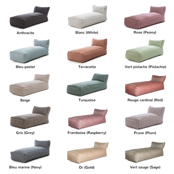 The lounge chair is available in 15 colours (anthracite, beige, blue navy, blue pastel, cardinal red, gold, grey, peony, plum, raspberry, terracotta, turquoise, pistachio green, sage green, white).