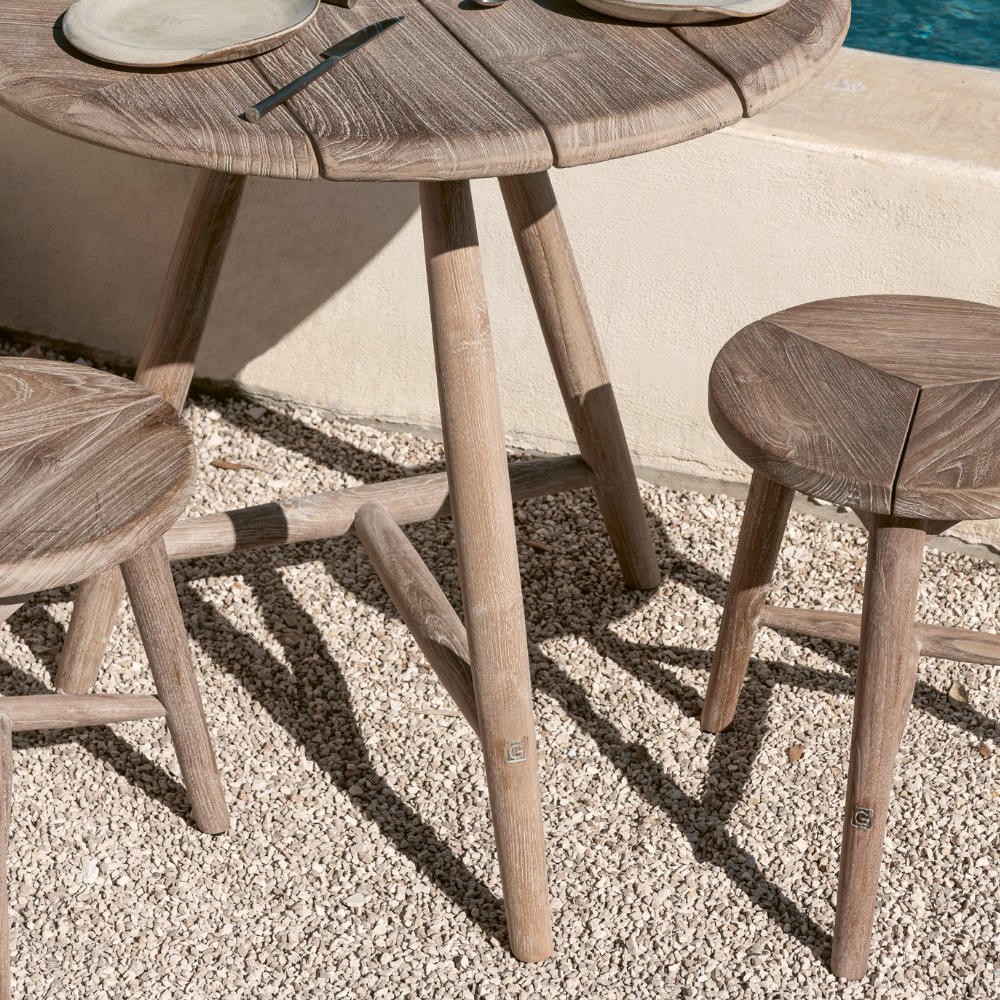 Il y a dans le tabouret de jardin ARBOLI quelque chose d'immédiatement juste. Peut-être la rondeur de son plateau, découpé en trois segments qui s'assemblent comme les pièces d'un puzzle naturel. Peut-être la chaleur de ce teck gris, patiné par les années bien avant d'arriver chez vous.