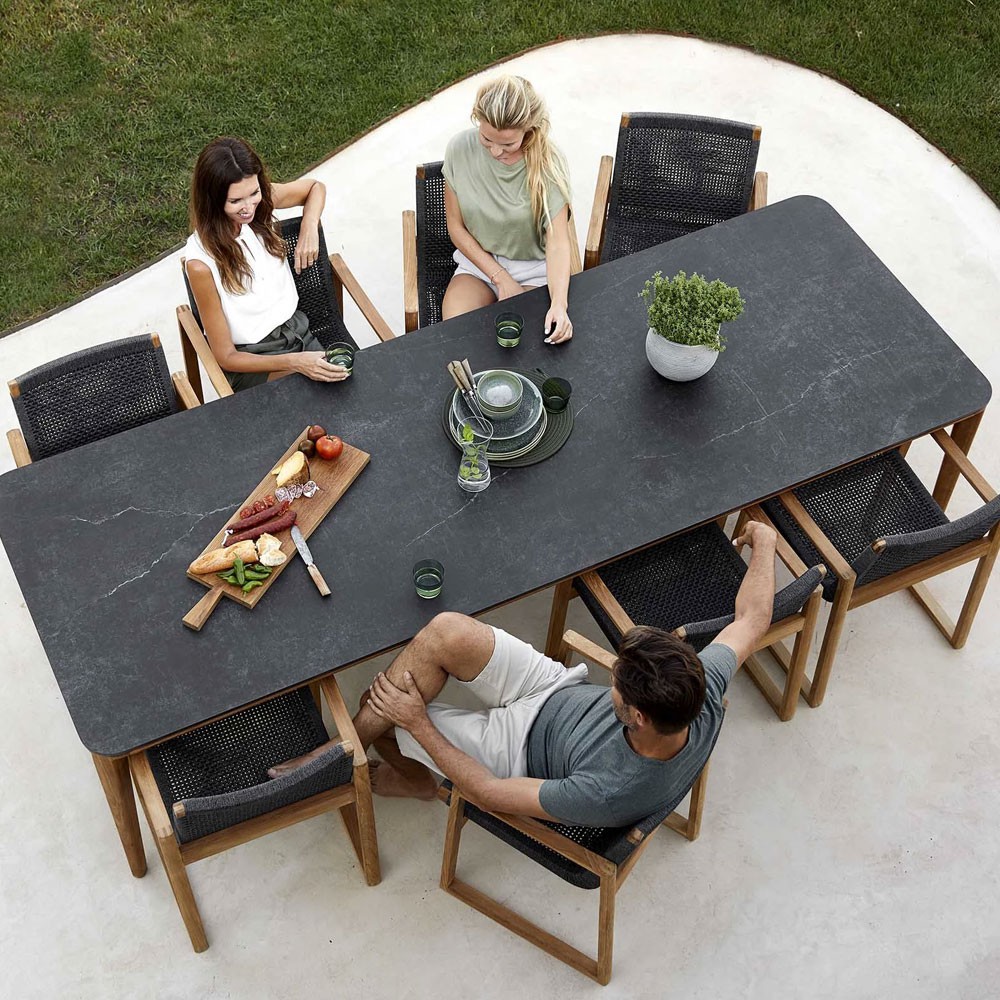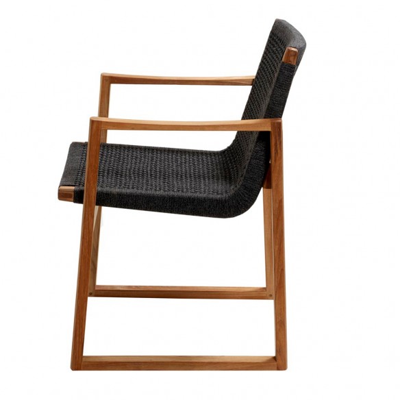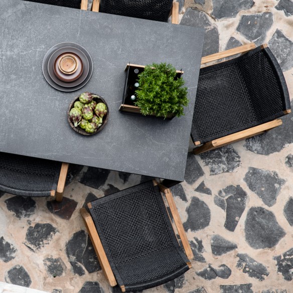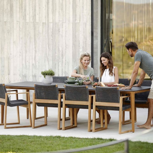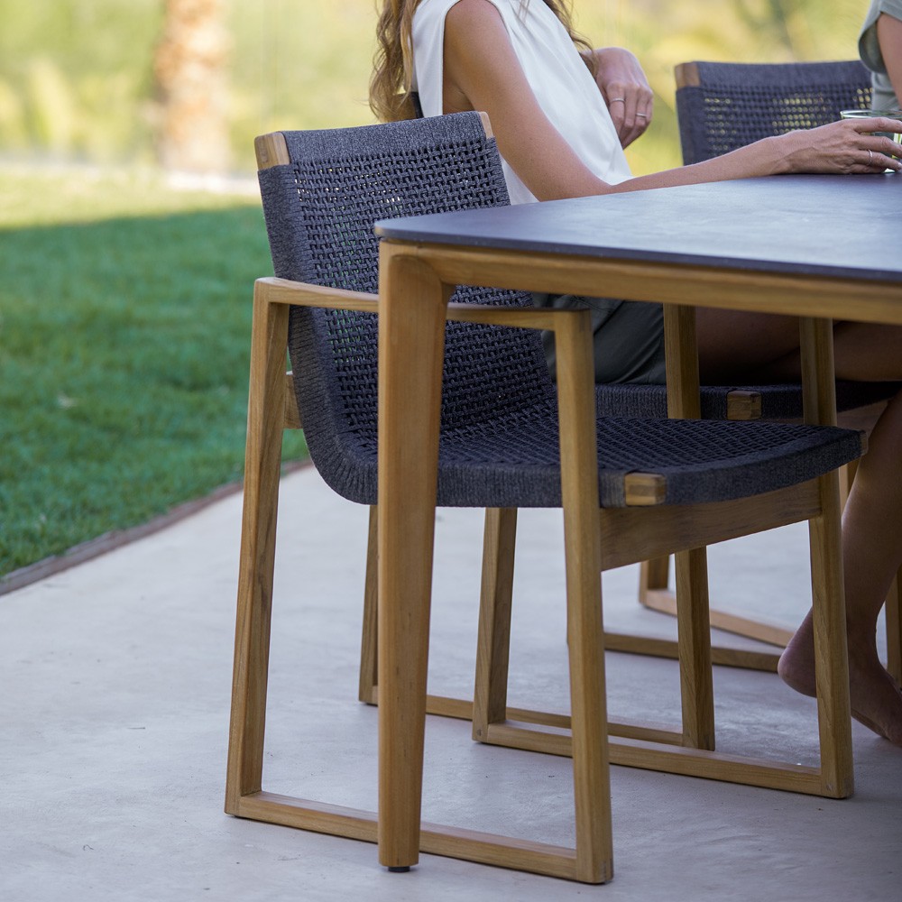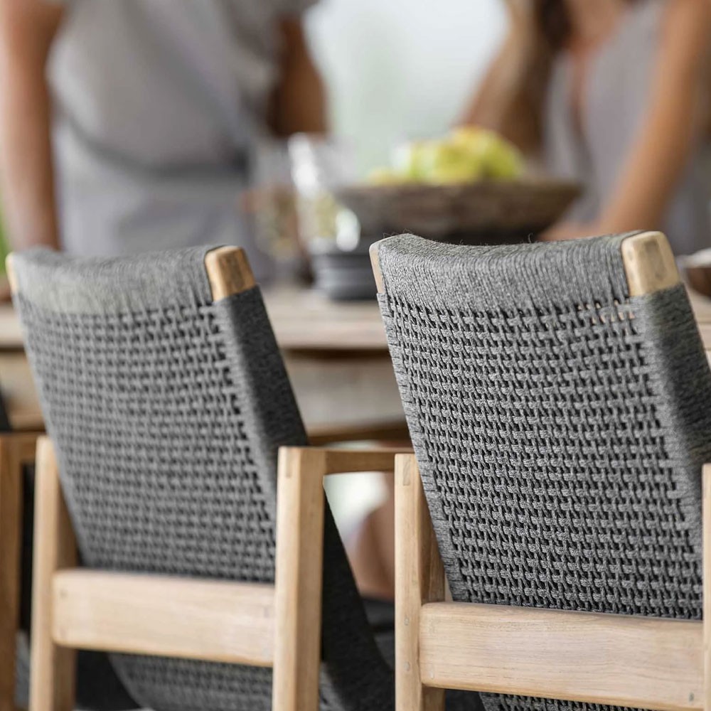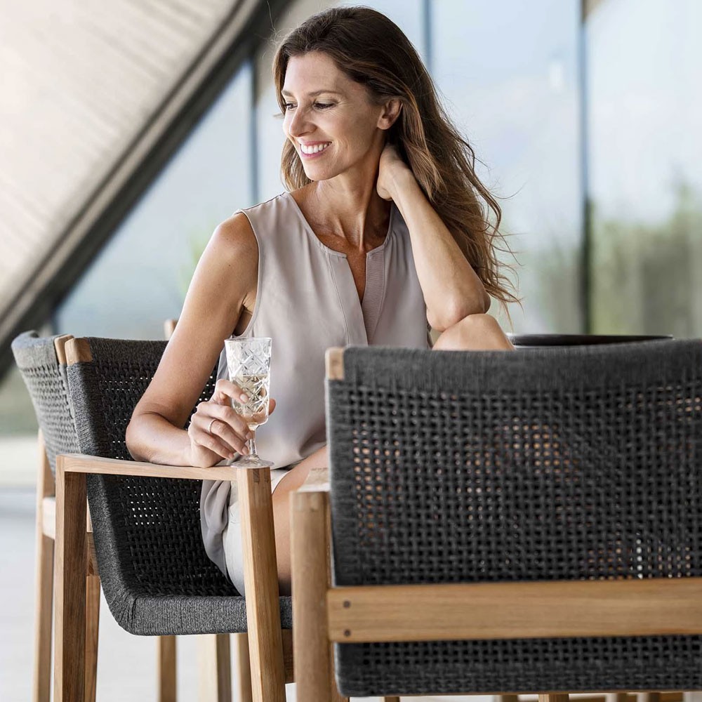 Endless est une chaise haut de gamme au design contemporain, réalisée avec des matériaux de luxe de haute qualité pour offrir un confort exceptionnel. Sculptée sur un cadre en teck, son assise et son dossier sont fabriqués en corde souple, tissée à la main. Cette fibre synthétique brevetée, qui imite l’aspect naturel du bois, est résistante aux UV et aux taches, tout en étant très confortable, ce qui en fait une matière idéale pour l'ameublement extérieur.