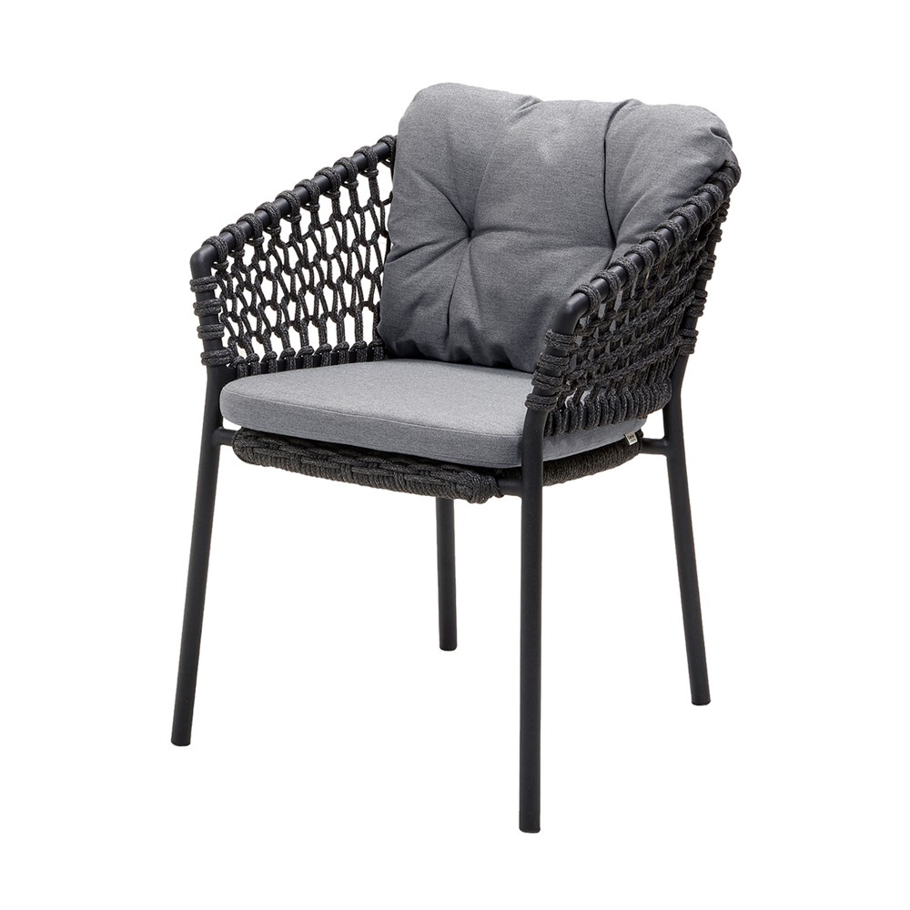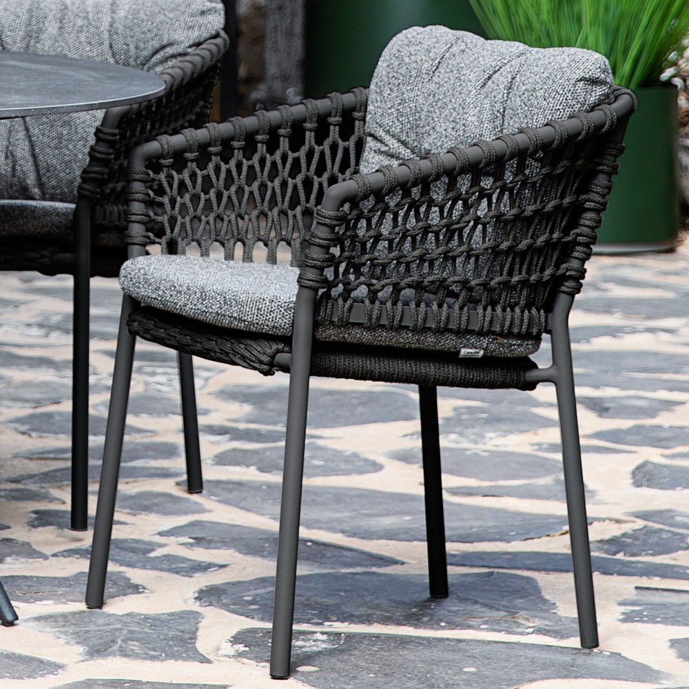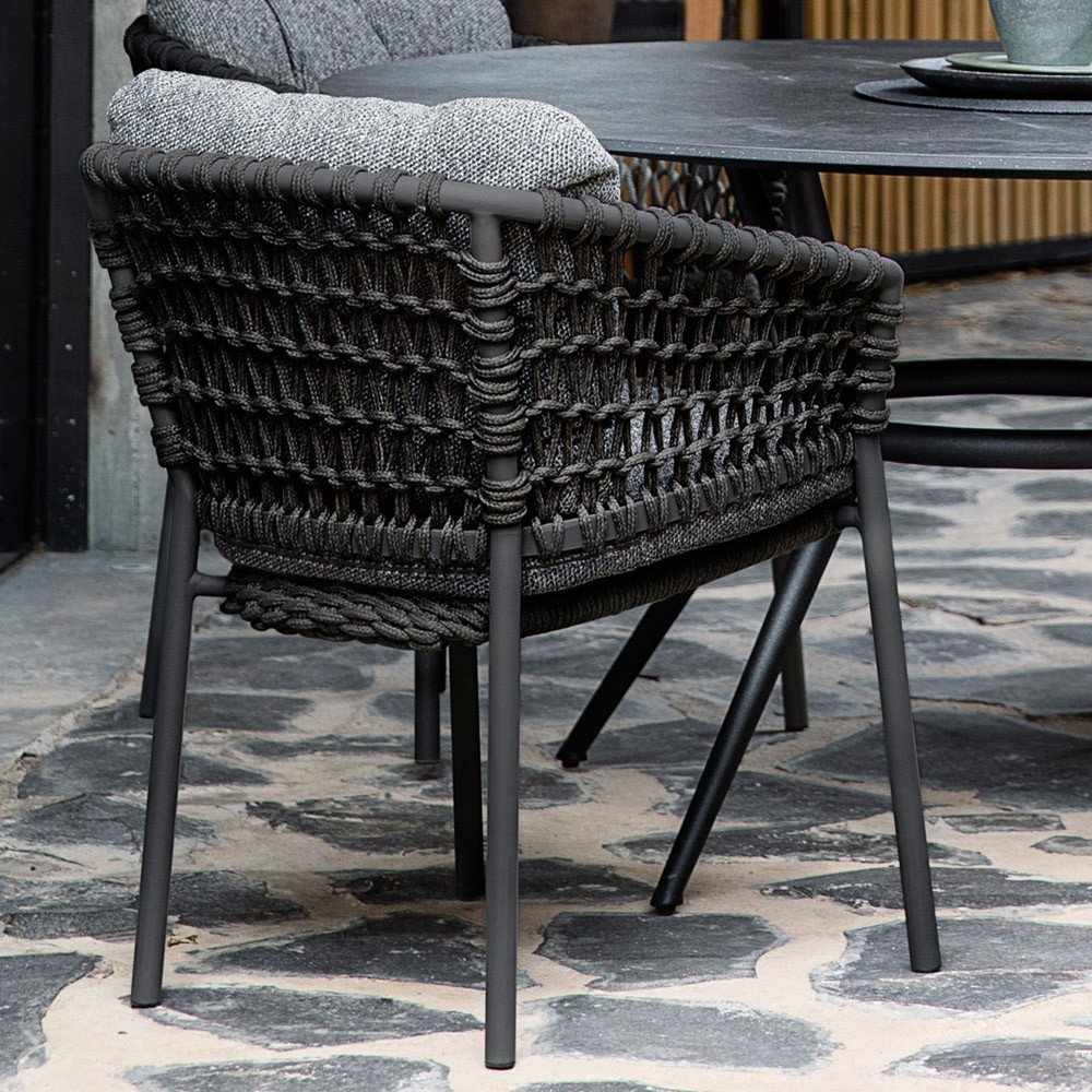 Avec son design élégant et son coussin incroyablement doux et confortable, la chaise Ocean vous invite à vous installer et à profiter pleinement de votre temps à l'extérieur. Le siège, le dossier et les accoudoirs sont tissés à la main en corde souple, fabriquée à partir de polypropylène. Ce matériau offre une sensation douce et naturelle au toucher, tout en garantissant un excellent confort et un bon maintien. Résistante aux UV et séchant rapidement, la corde est idéale pour une utilisation en extérieur. Le cadre et les pieds, en aluminium enduit de poudre de couleur gris foncé, sont légers, solides et résistants à la corrosion. De plus, les housses de coussin sont amovibles et lavables en machine.