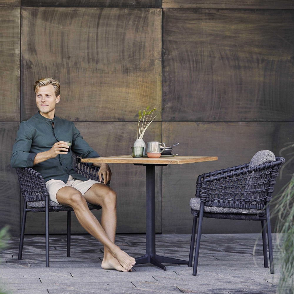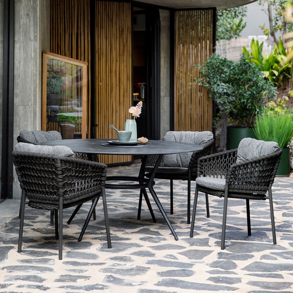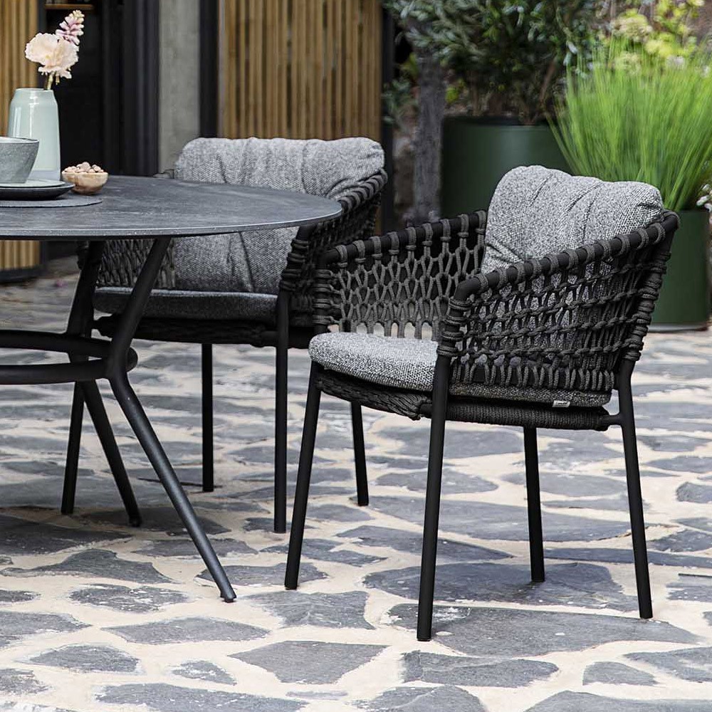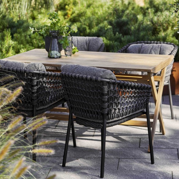 Avec son design élégant et son coussin incroyablement doux et confortable, la chaise Ocean vous invite à vous installer et à profiter pleinement de votre temps à l'extérieur. Le siège, le dossier et les accoudoirs sont tissés à la main en corde souple, fabriquée à partir de polypropylène. Ce matériau offre une sensation douce et naturelle au toucher, tout en garantissant un excellent confort et un bon maintien. Résistante aux UV et séchant rapidement, la corde est idéale pour une utilisation en extérieur. Le cadre et les pieds, en aluminium enduit de poudre de couleur gris foncé, sont légers, solides et résistants à la corrosion. De plus, les housses de coussin sont amovibles et lavables en machine.