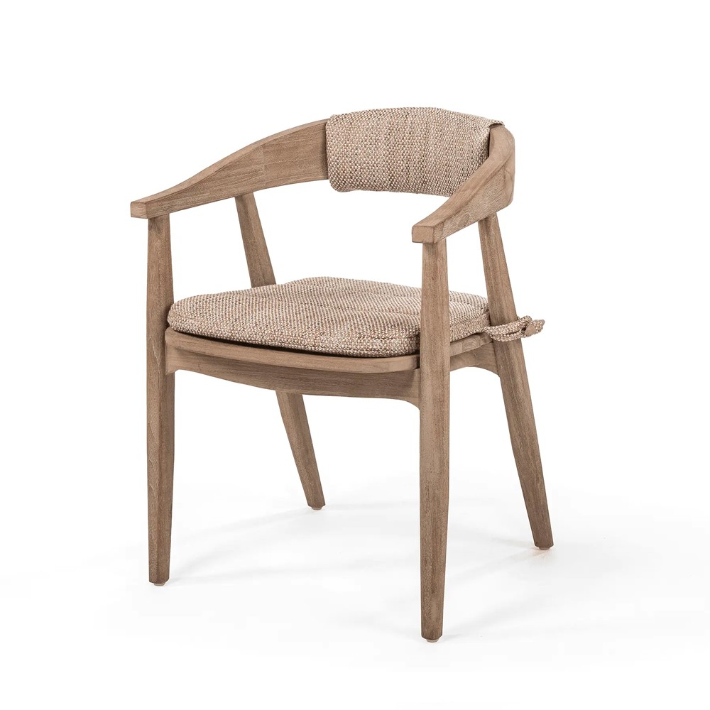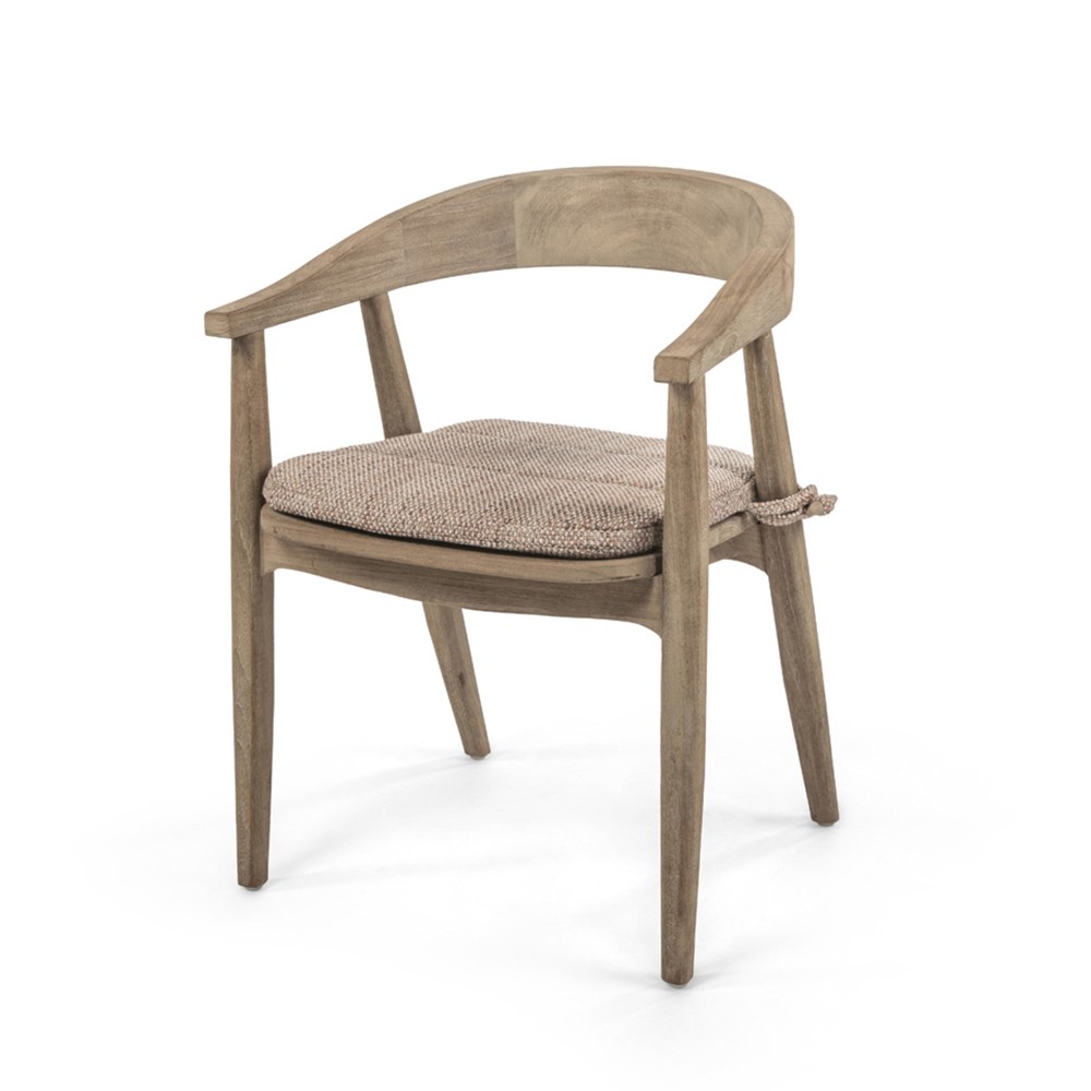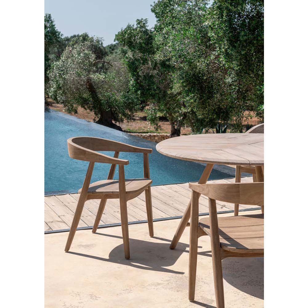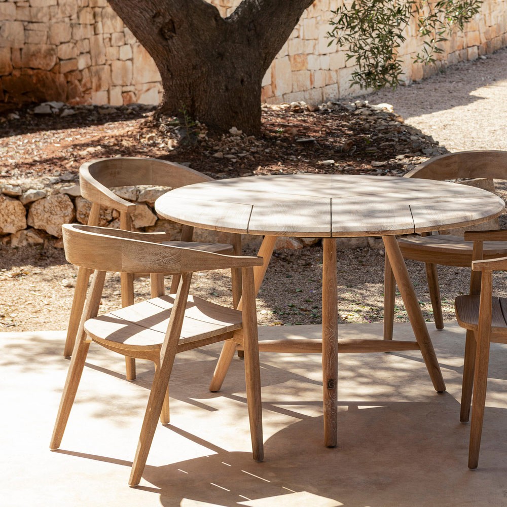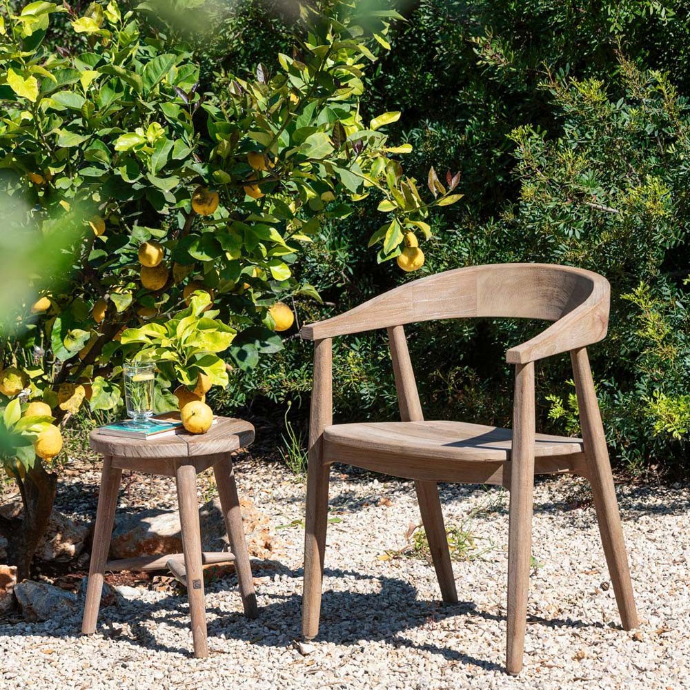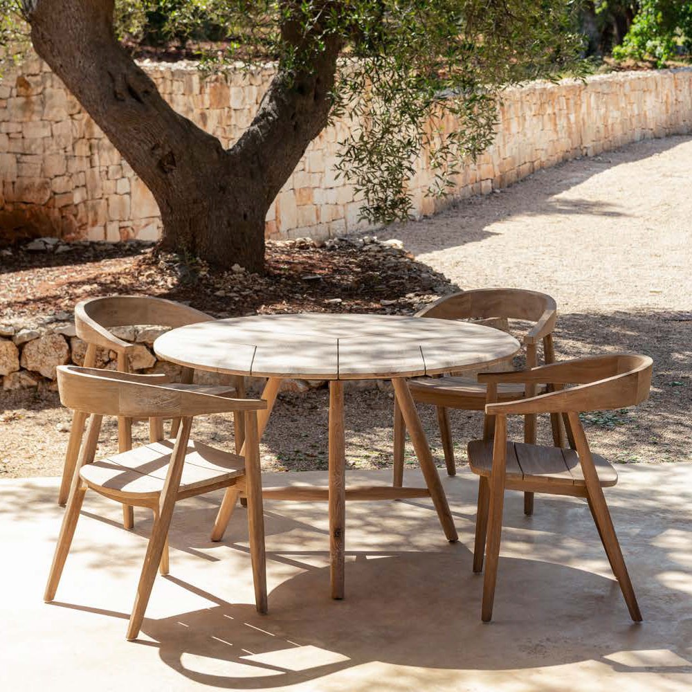 - Chaise : Bois de teck recyclé, issu de charpentes anciennes, de bateaux ou de trains. Ce teck, parfois centenaire, témoigne d’une époque où l’on choisissait les essences les plus nobles, tout en adoptant un style résolument contemporain.