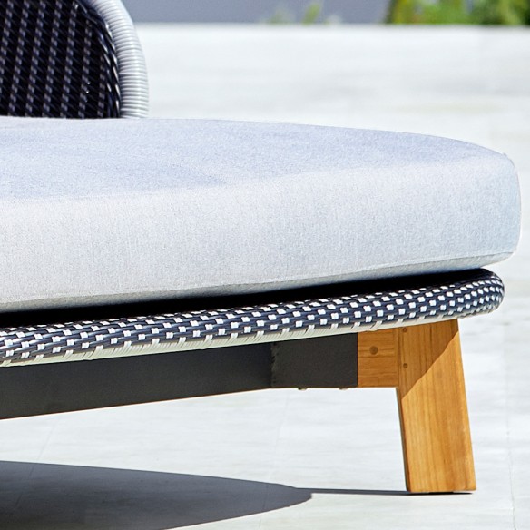 Sa structure robuste en teck certifié est complétée par un dossier en résine tressée bicolore, qui apporte une touche unique et moderne à ce bain de soleil. Doté d’une petite tablette centrale en teck, il peut également accueillir un parasol en option.