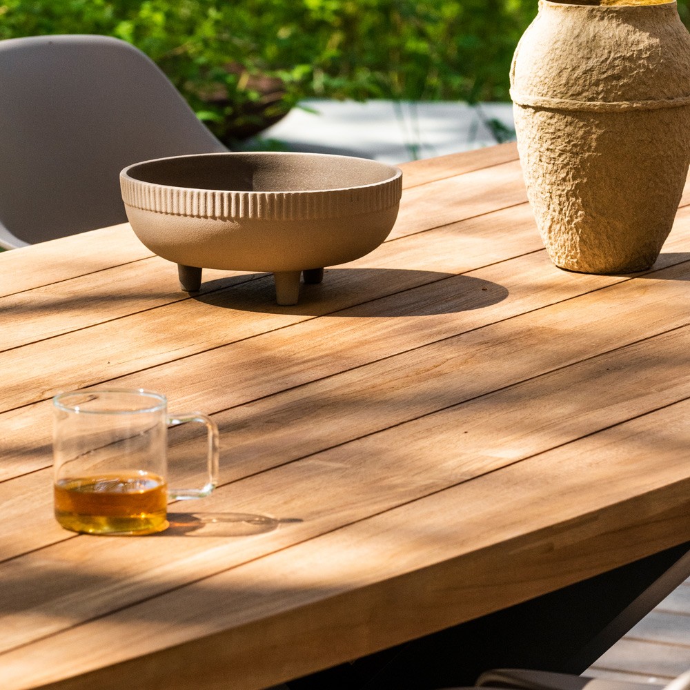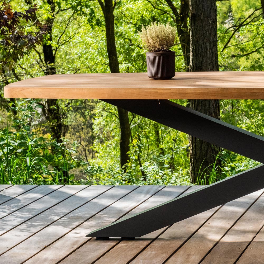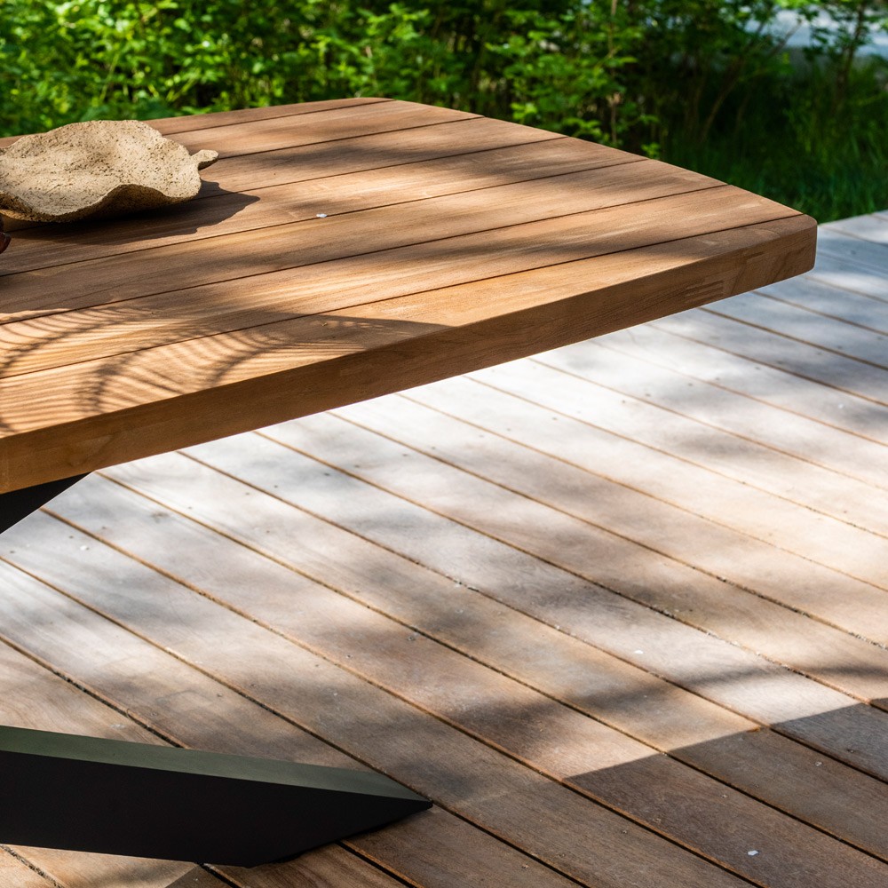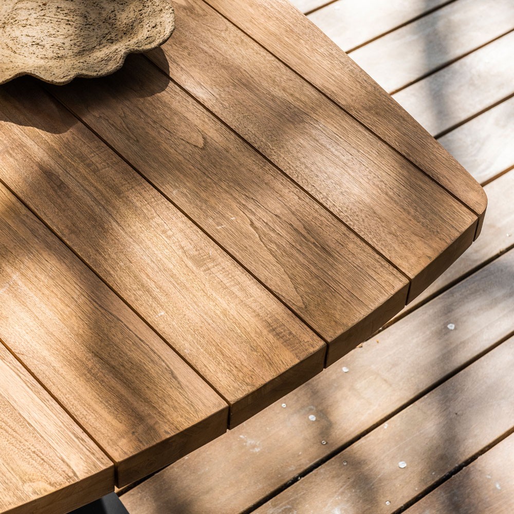 Le plateau en teck certifié repose sur un pied central en aluminium gris anthracite thermolaqué dont la forme émerveillera vos convives de par son originalité. Bien pensée, cette table offre un vaste espace pour les pieds, permettant ainsi de rajouter quelques places supplémentaires pour vos grandes tablées.