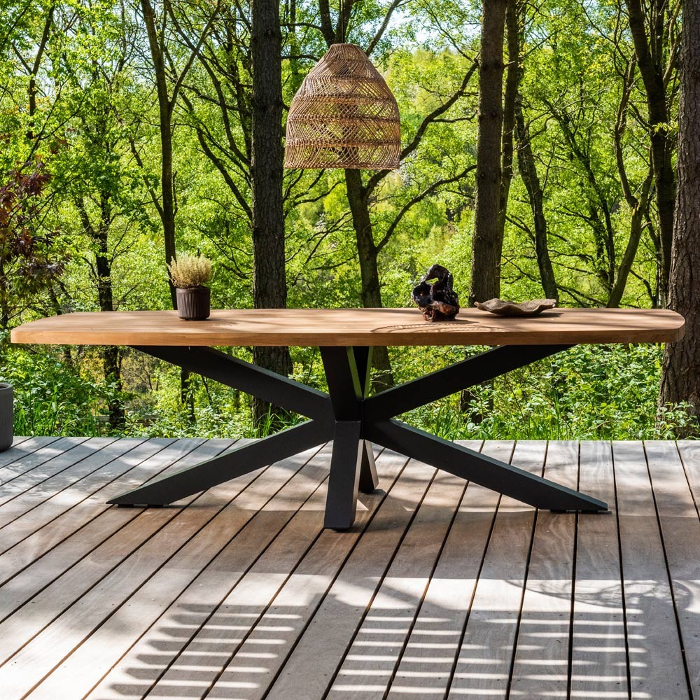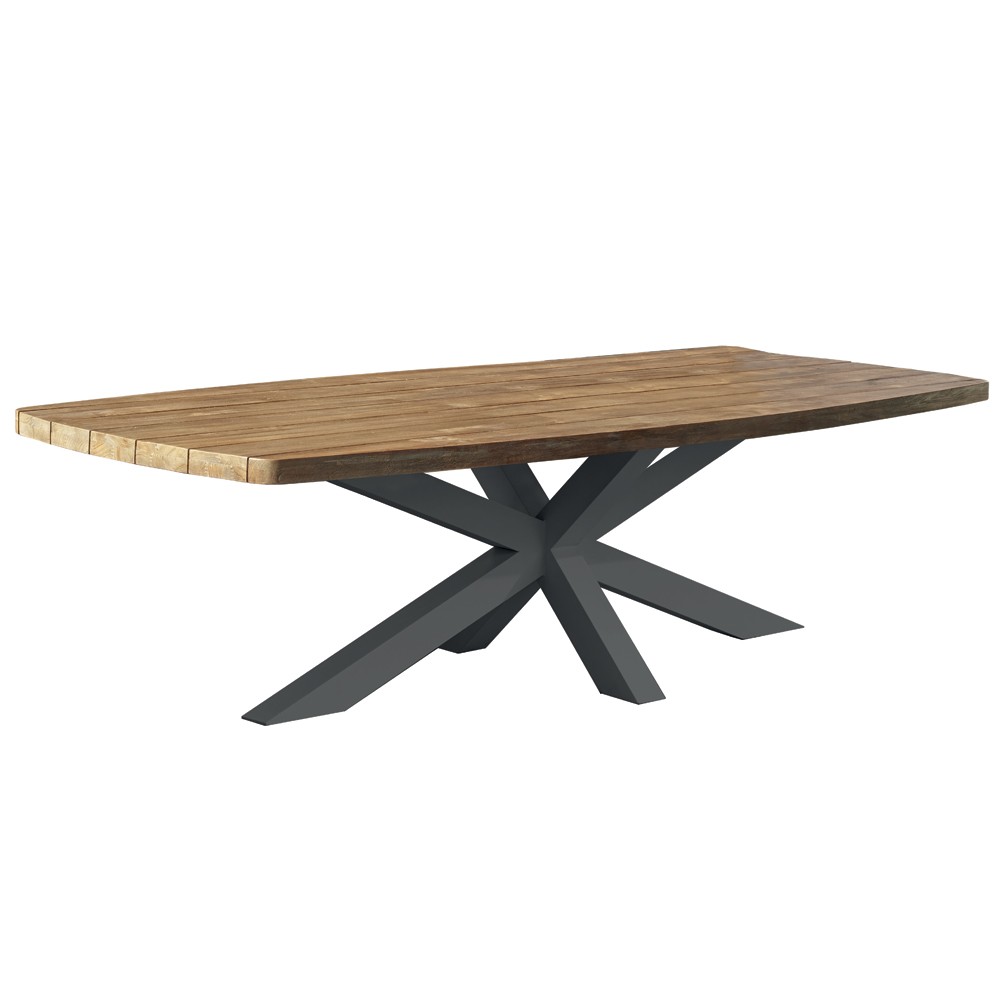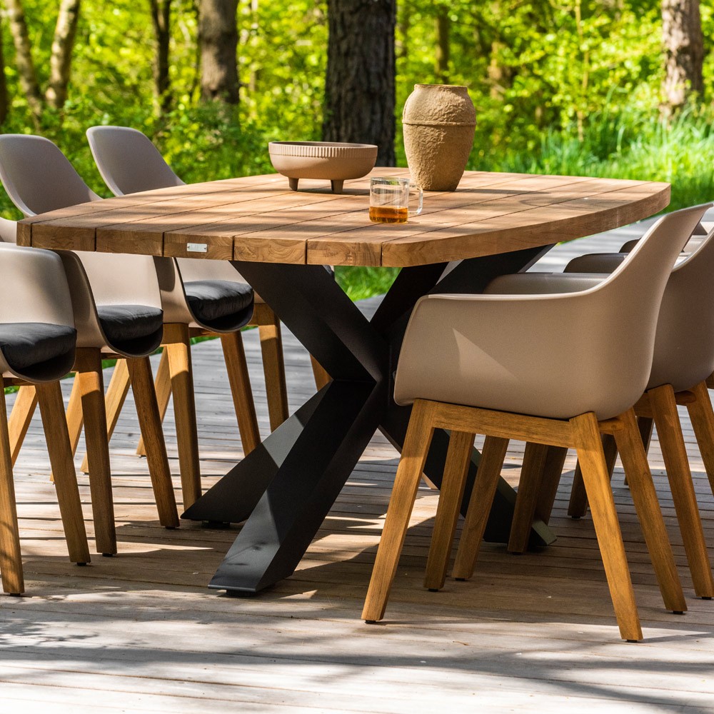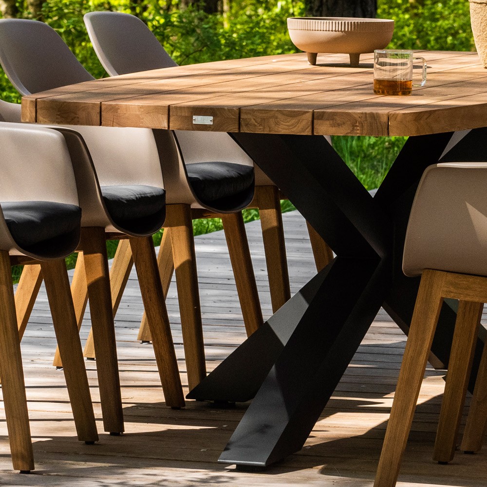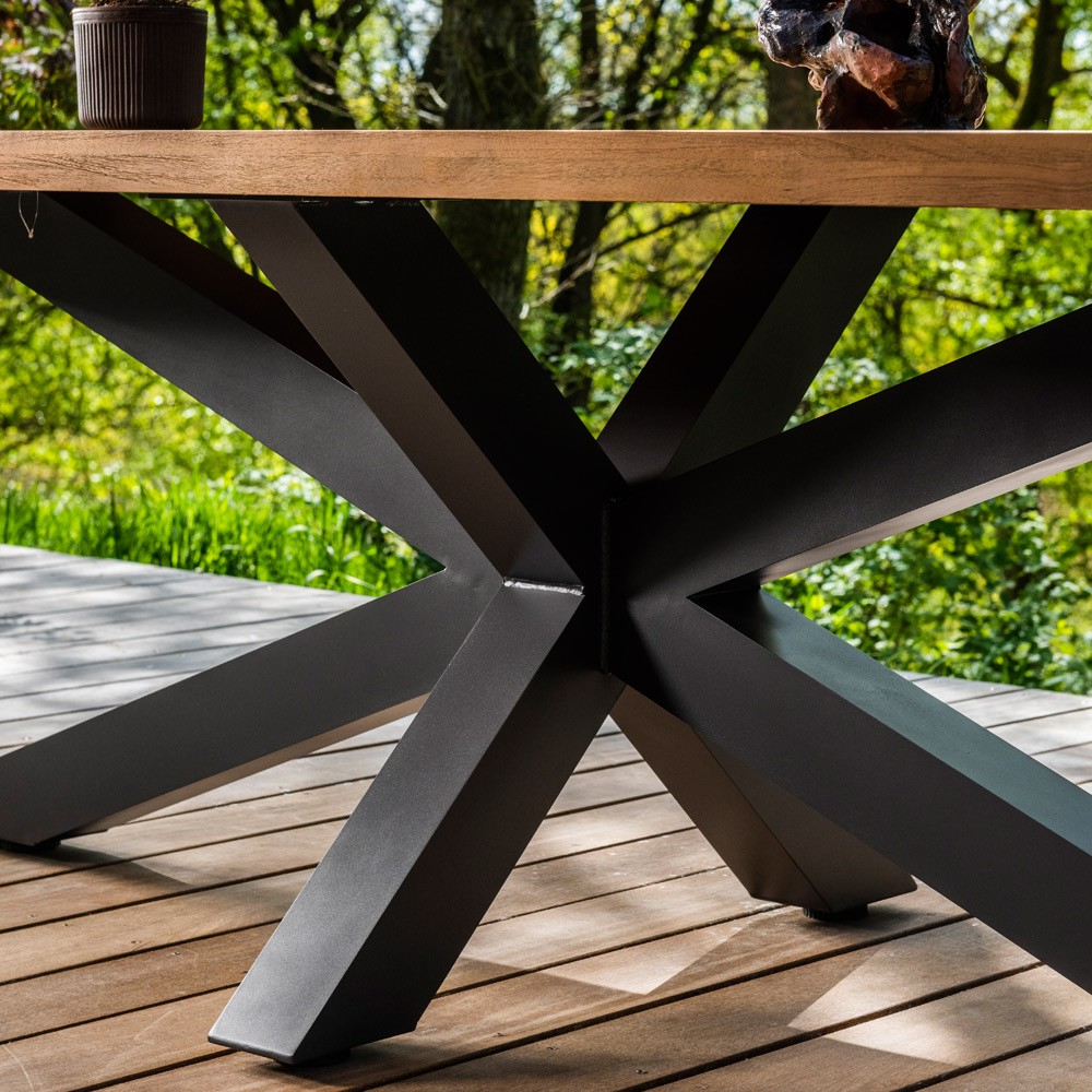 Le plateau en teck certifié repose sur un pied central en aluminium gris anthracite thermolaqué dont la forme émerveillera vos convives de par son originalité. Bien pensée, cette table offre un vaste espace pour les pieds, permettant ainsi de rajouter quelques places supplémentaires pour vos grandes tablées.