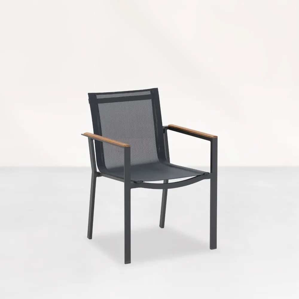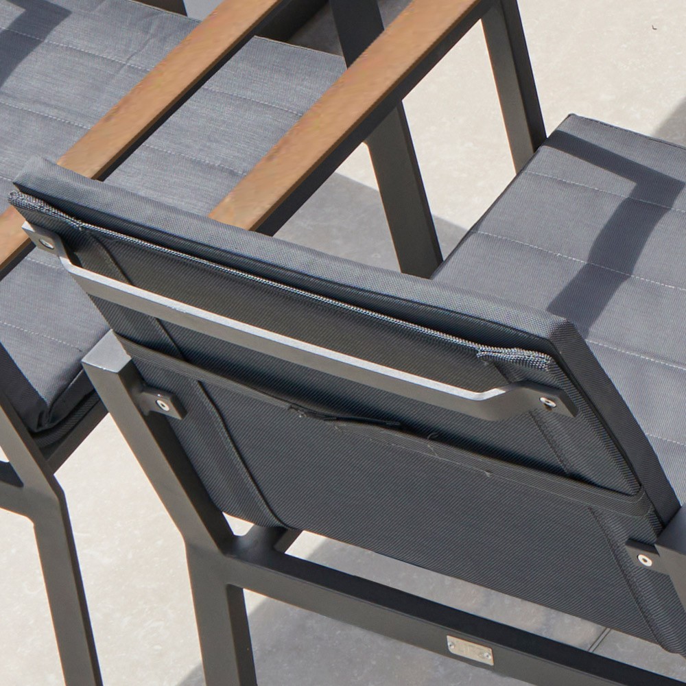 Le plateau de la table est robuste, avec ses 8cm d’épaisseur, et repose sur un cadre en aluminium gris anthracite thermolaqué tout comme celui de la chaise SOHO. Le revêtement de la chaise est en textylène, et résiste aux aléas climatiques tout au long de l’année. Pour plus de confort les chaises sont dotées d’un coussin en 1 pièce, au tissu résistant aux UV et aux intempéries. Pratiques et élégantes avec leurs accoudoirs en teck, les chaises SOHO sont également empilables, facile d’entretien et légères pour faciliter leur déplacement.