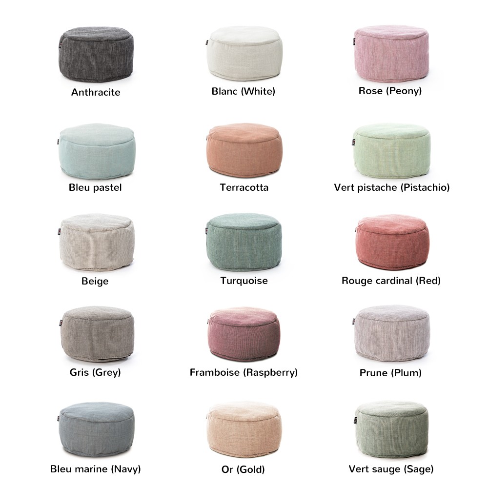 Fabriqué en Belgique, ce pouf résistant est disponible en 15 coloris (anthracite, beige, bleu marine, bleu pastel, blanc, framboise, gris, or, rose, rouge cardinal, prune, terracotta, turquoise, vert pistache, vert sauge).