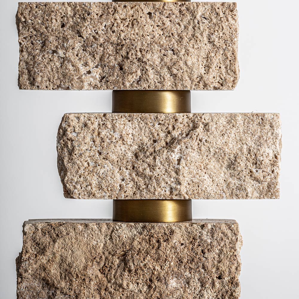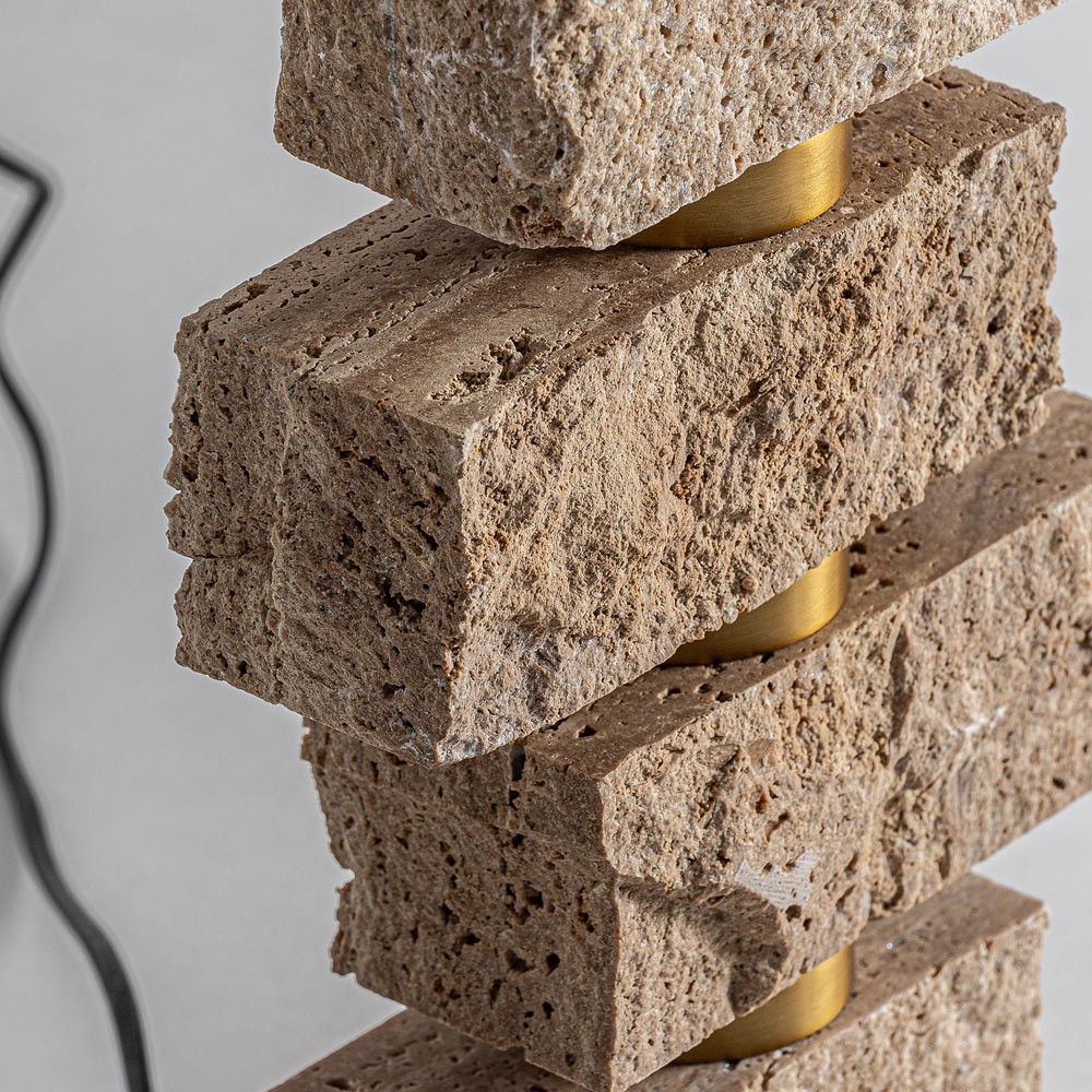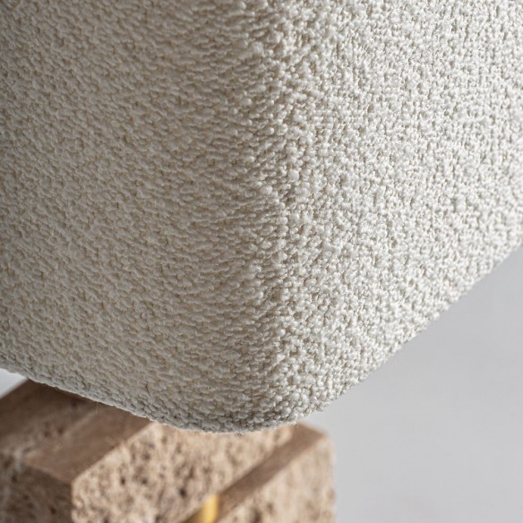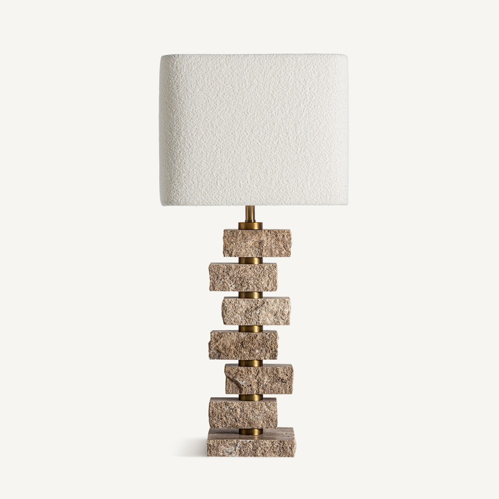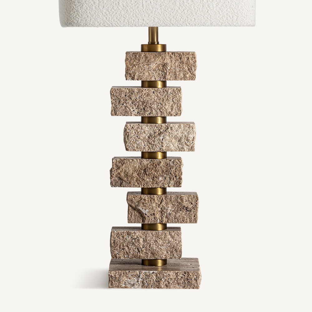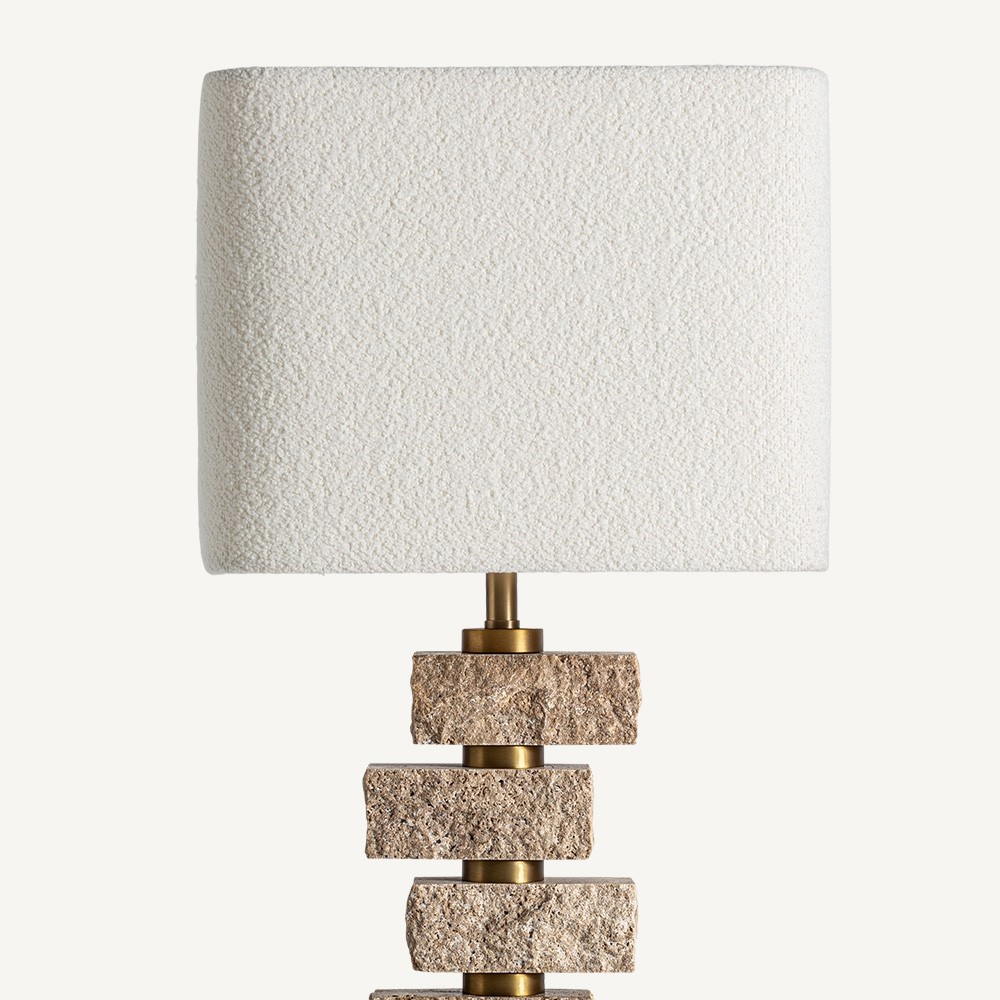 La base de la lampe est composée de plusieurs morceaux de marbre délicatement espacés par un tube central en bronze, créant un contraste harmonieux entre la chaleur métallique et la pureté du marbre. Son abat-jour en tissu bouclé crème complète l'ensemble en ajoutant une douceur subtile, tout en diffusant une lumière apaisante.