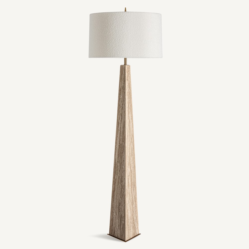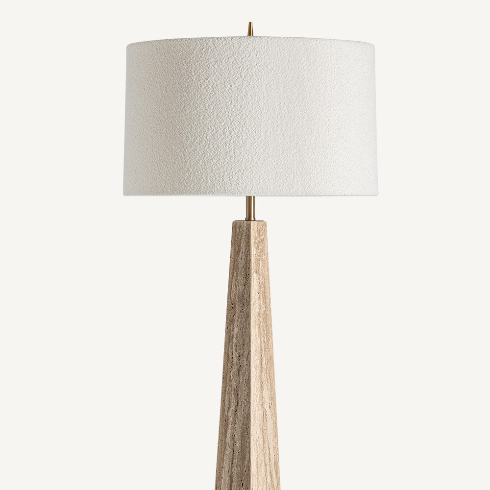 L'abat-jour en tissu bouclé blanc adoucit l'éclat de la lumière, créant une atmosphère chaleureuse et sophistiquée. Avec ses lignes géométriques et sa hauteur impressionnante de 164 cm, TRIANZA est plus qu’une lampe : c’est une œuvre d’art, prête à sublimer votre salon.
