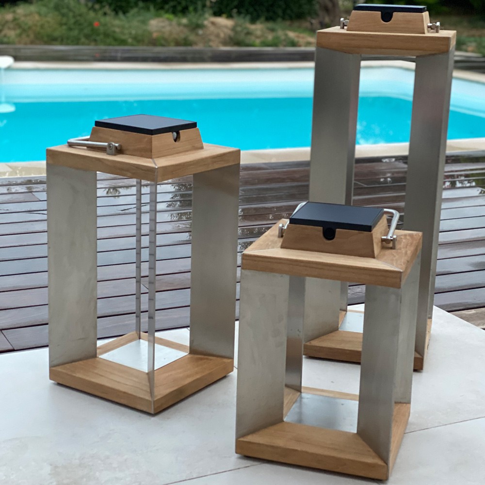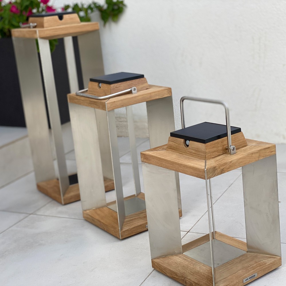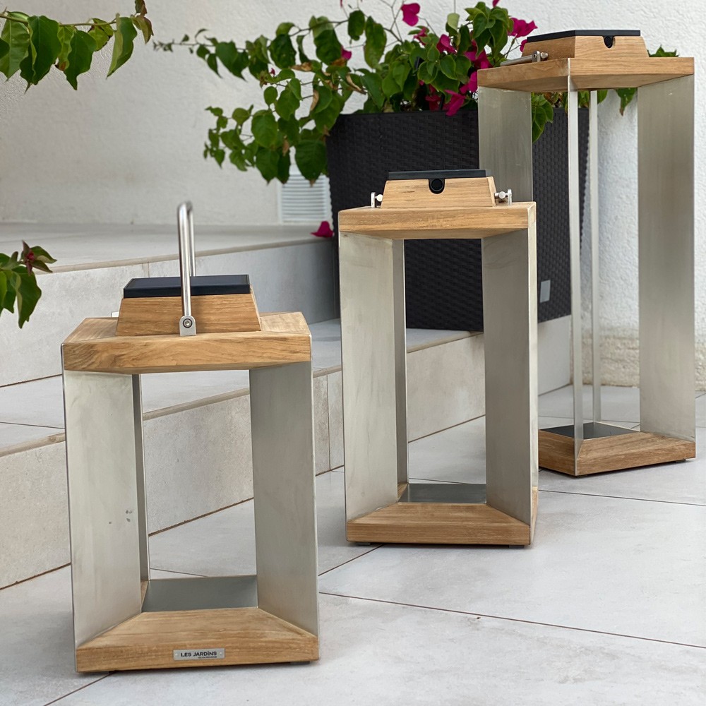 Conçues en France, esthétiques et robustes ces 3 lanternes solaires en Teck et inox illumineront votre jardin, patio ou terrasse à la tombée de la nuit.
