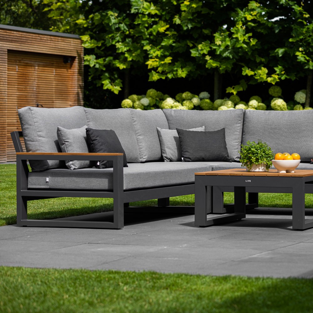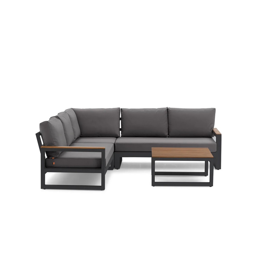 Ce salon de jardin d'angle est accompagné d’une table basse carrée ainsi que 6 coussins décoratifs.