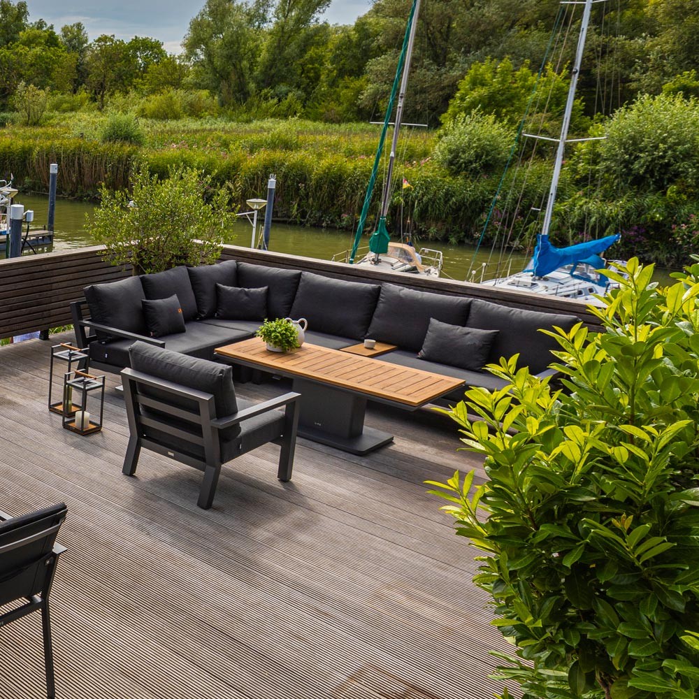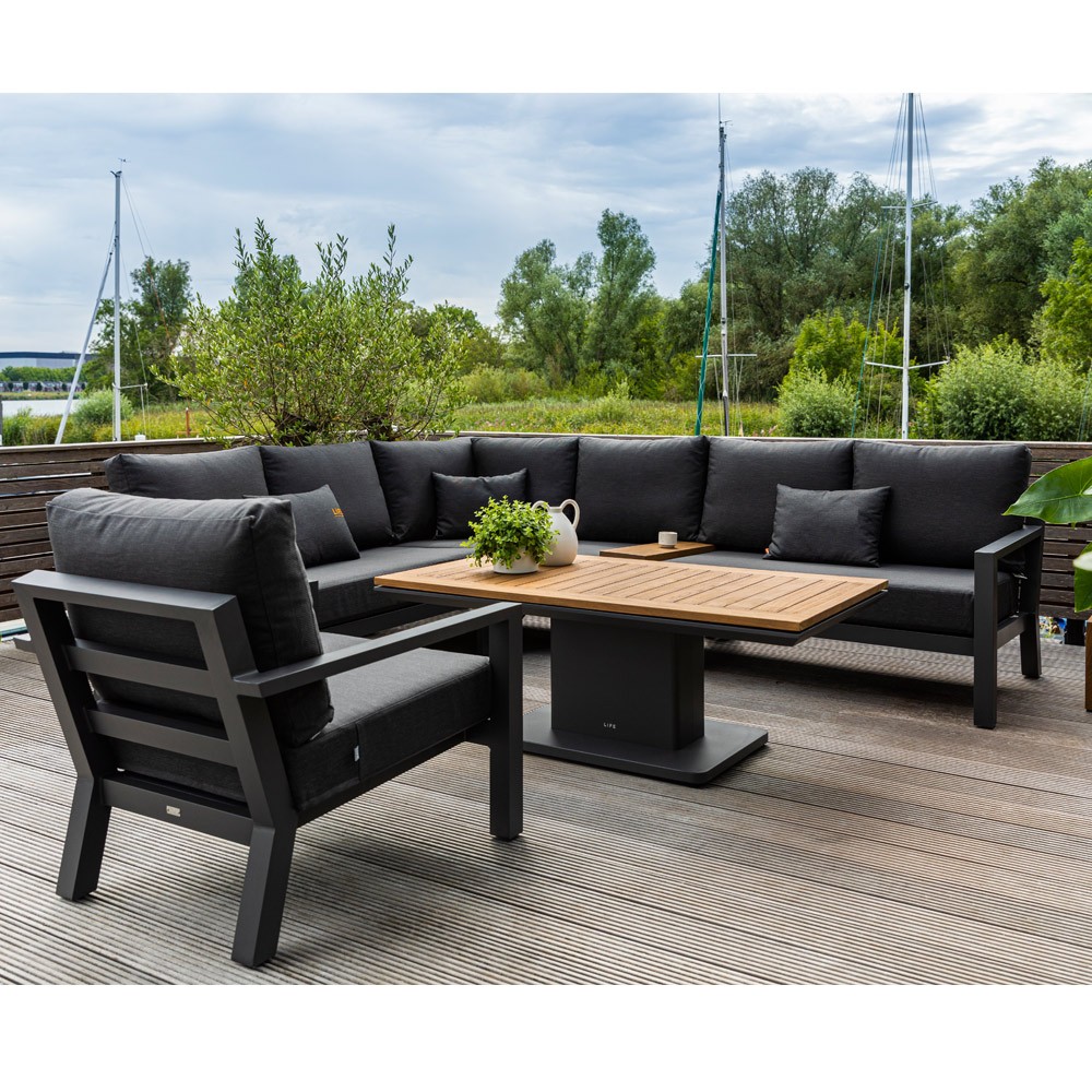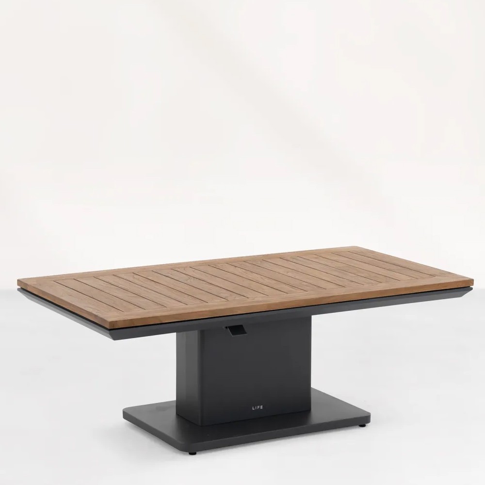 Le salon de jardin TIMBER GRAPHITE offre confort d’assise grâce à ses coussins épais, et robustesse grâce à son cadre en aluminium. Le teck recouvrant la table basse et le mini plateau apporte une note chaleureuse à votre espace extérieur. Autre avantage, la table basse réglable en hauteur vous permettra de l’ajuster en fonction de vos envies et préférences. La table basse relevable offre ainsi l’avantage de s’adapter à différents besoins. Vous pouvez l’utiliser pour prendre le thé, poser les apéritifs, ou encore pour partager un repas avec un proche.