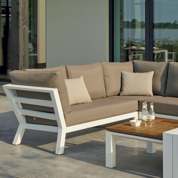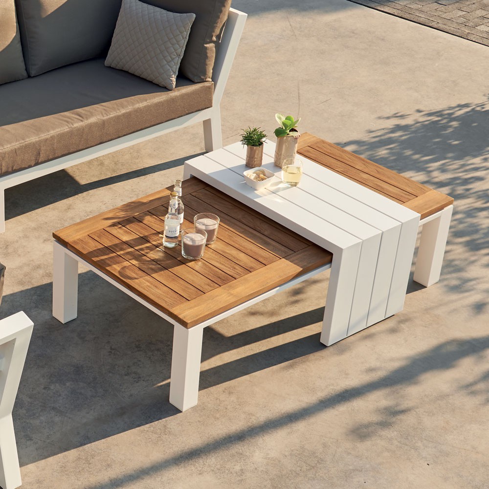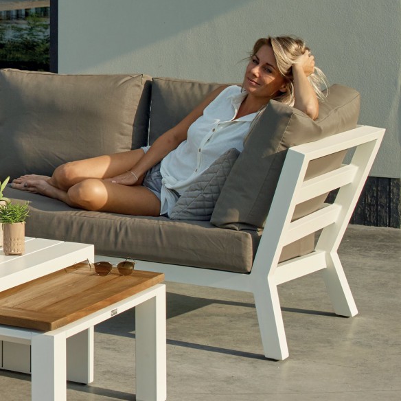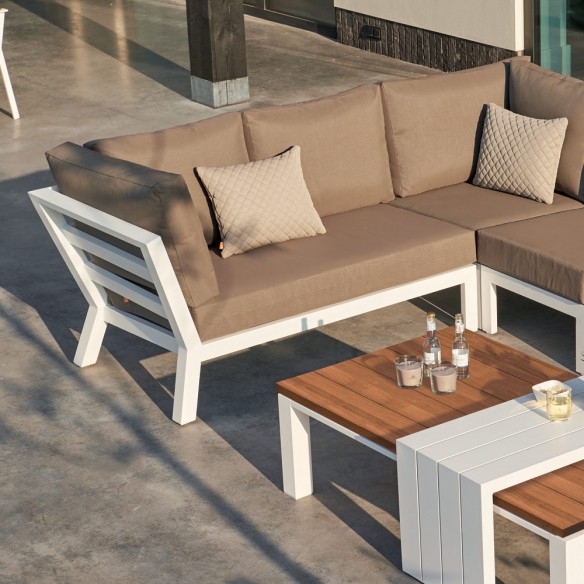 L'ensemble salon de jardin Timber séduit par ses lignes équilibrées et un grand confort d'assise. La particularité de cet ensemble tient au fait que les accoudoirs sont hauts aux extrémités du salon. Le plateau de la table basse est en teck et procure un aspect naturel et chaleureux à l’ensemble. De plus, ce salon est muni d’un support de table blanc, permettant ainsi de créer un véritable espace de convivialité.