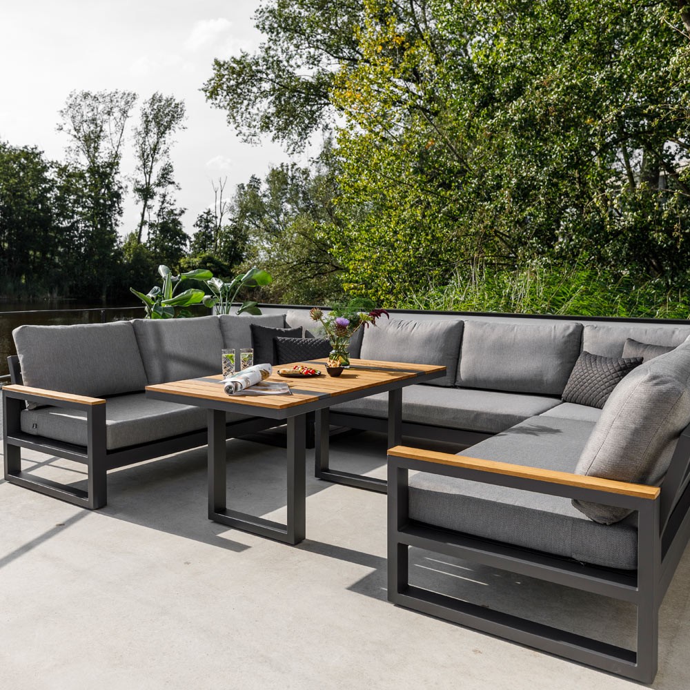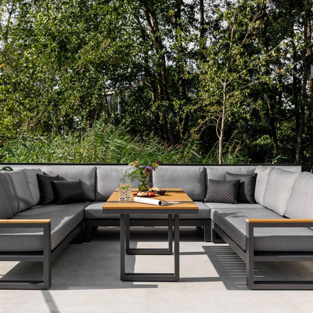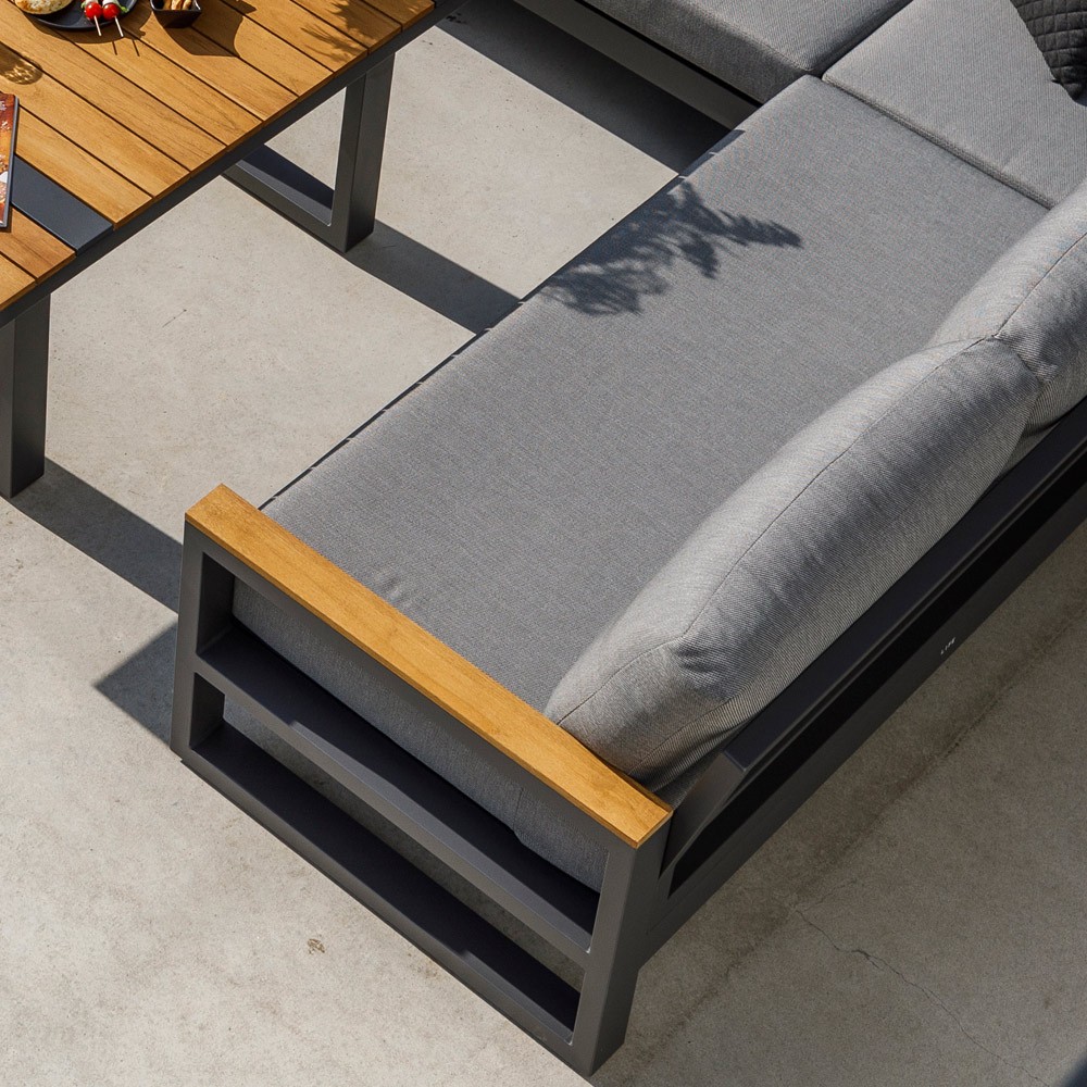 Offrez-vous un espace détente chic et confortable avec le salon de jardin SOHO MISTGREY. Conçu pour accueillir jusqu'à 8 personnes, il allie élégance et robustesse grâce à sa structure en aluminium gris anthracite et ses accoudoirs en teck naturel. Ce salon de jardin d'angle est accompagné d’une table basse ainsi que 8 coussins décoratifs.