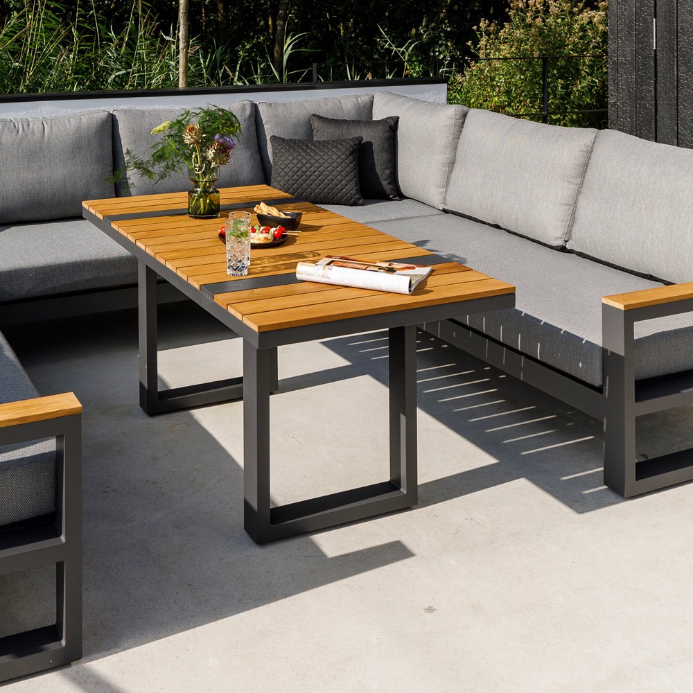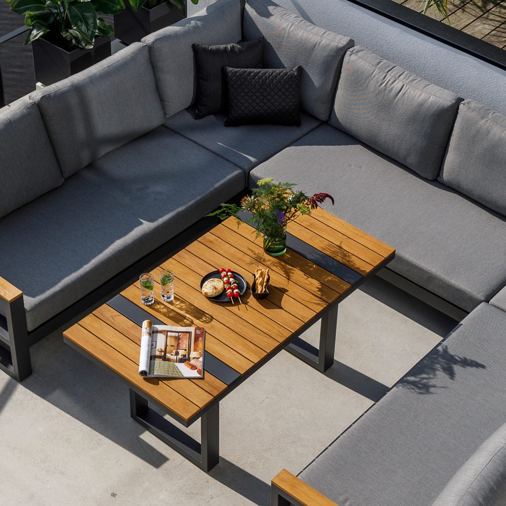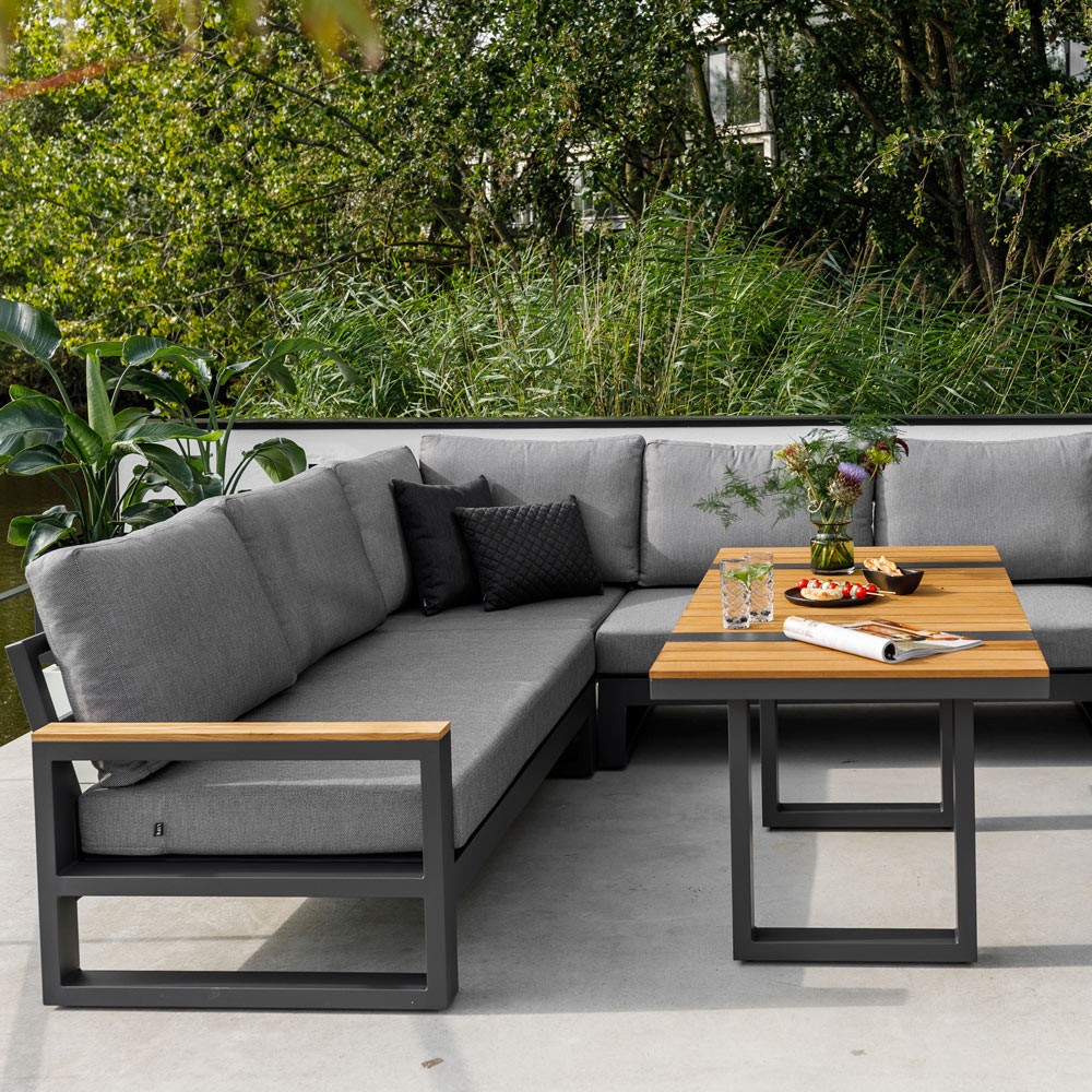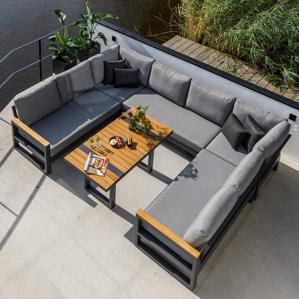 Offrez-vous un espace détente chic et confortable avec le salon de jardin SOHO MISTGREY. Conçu pour accueillir jusqu'à 8 personnes, il allie élégance et robustesse grâce à sa structure en aluminium gris anthracite et ses accoudoirs en teck naturel. Ce salon de jardin d'angle est accompagné d’une table basse ainsi que 8 coussins décoratifs.