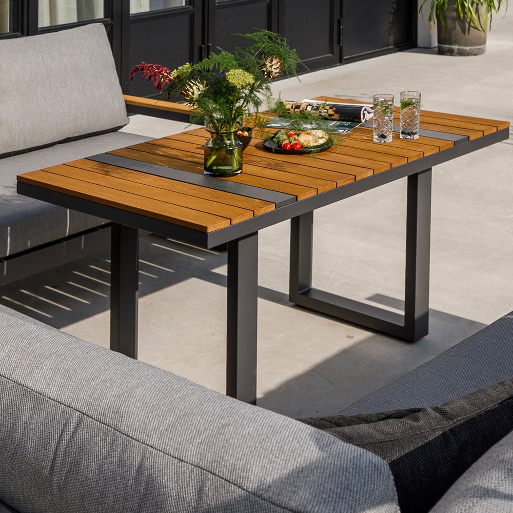 La table basse rectangulaire, assortie au salon, est dotée d’un plateau en teck naturel, parfait pour vos apéritifs ou repas en extérieur. Sa hauteur idéale permet une utilisation polyvalente, du café du matin aux dîners en plein air.