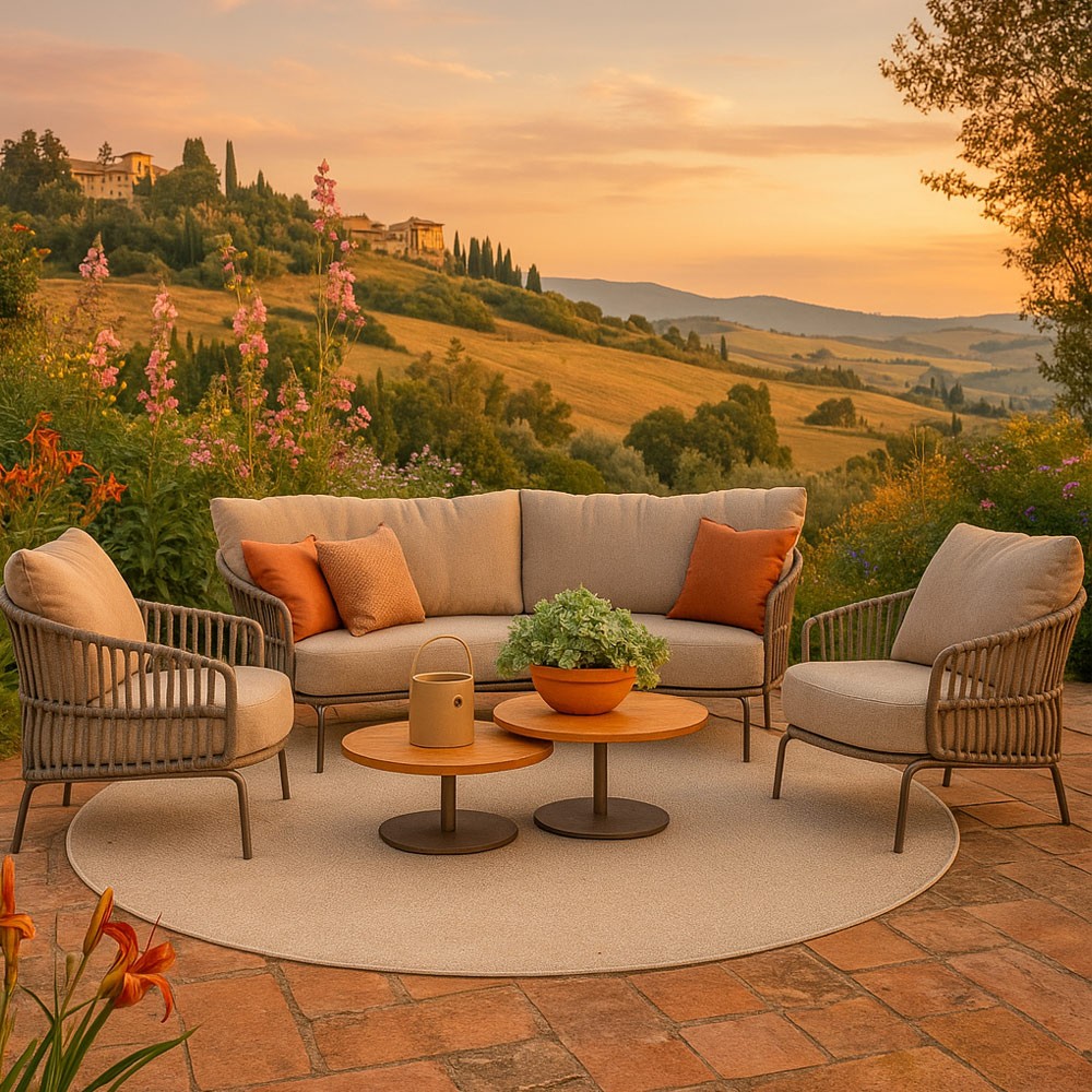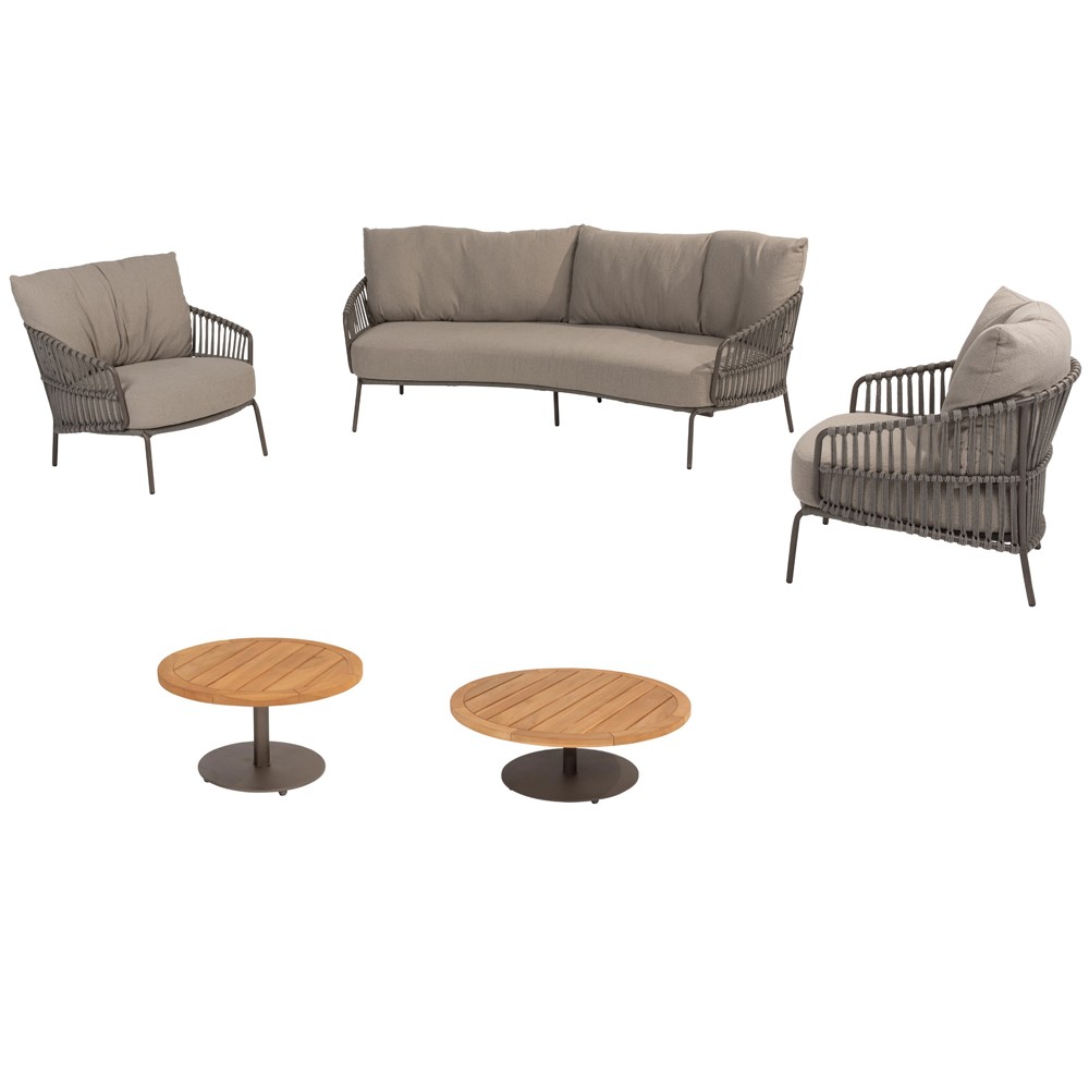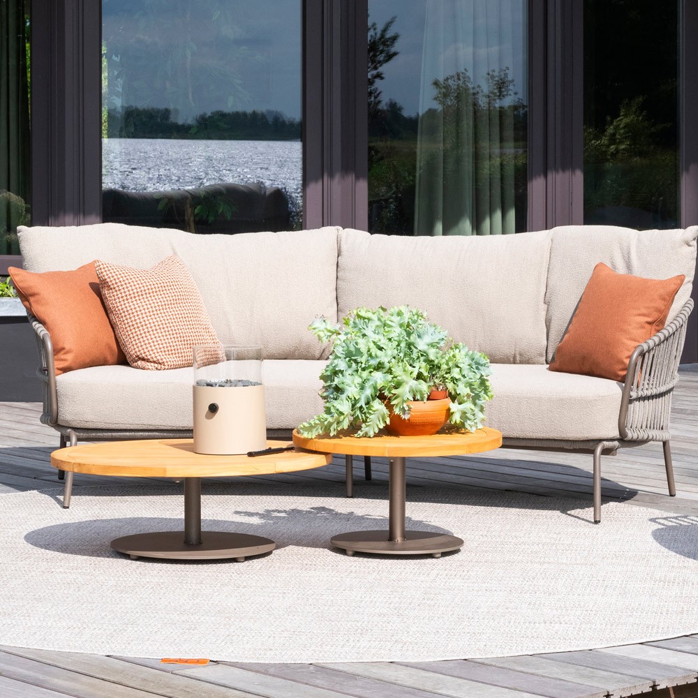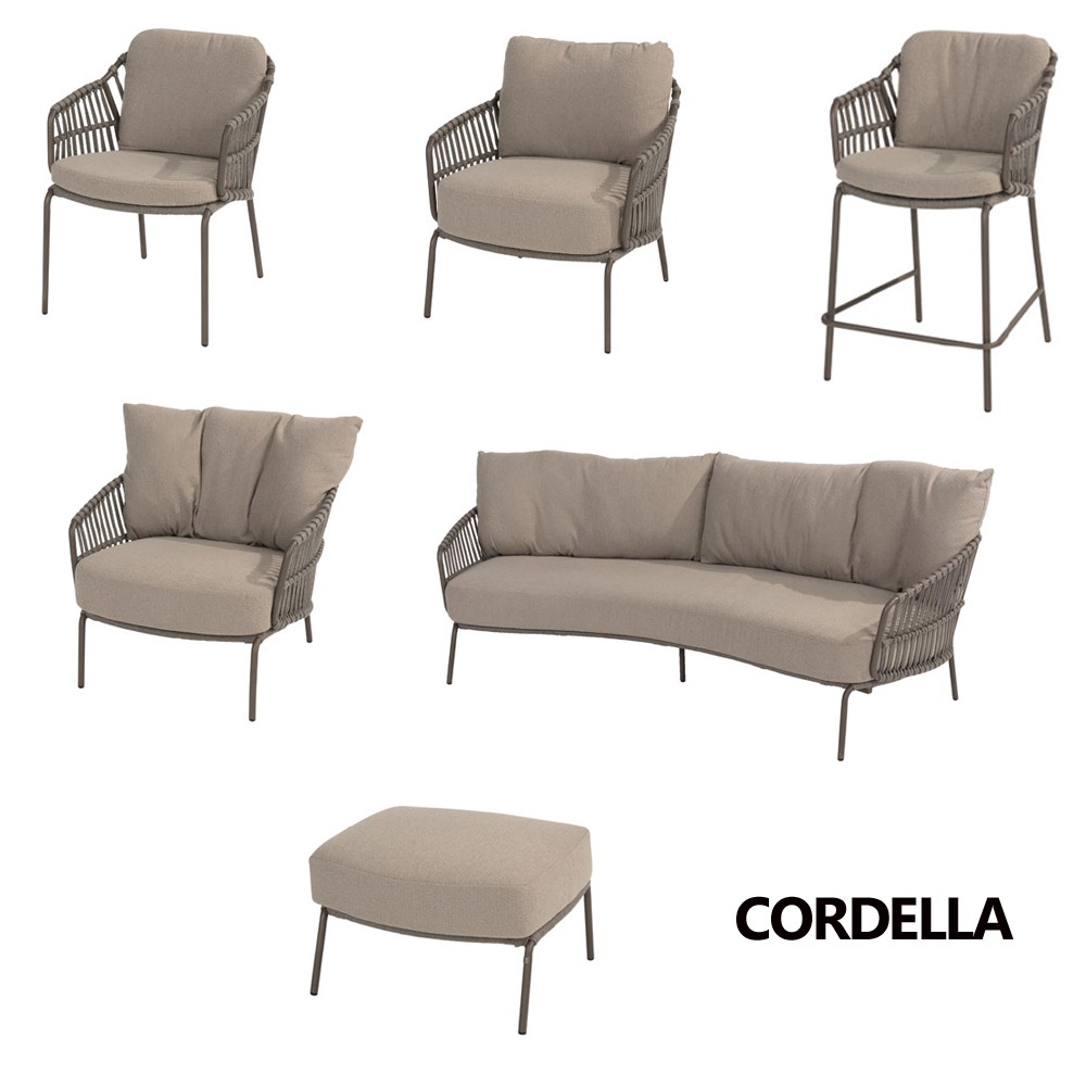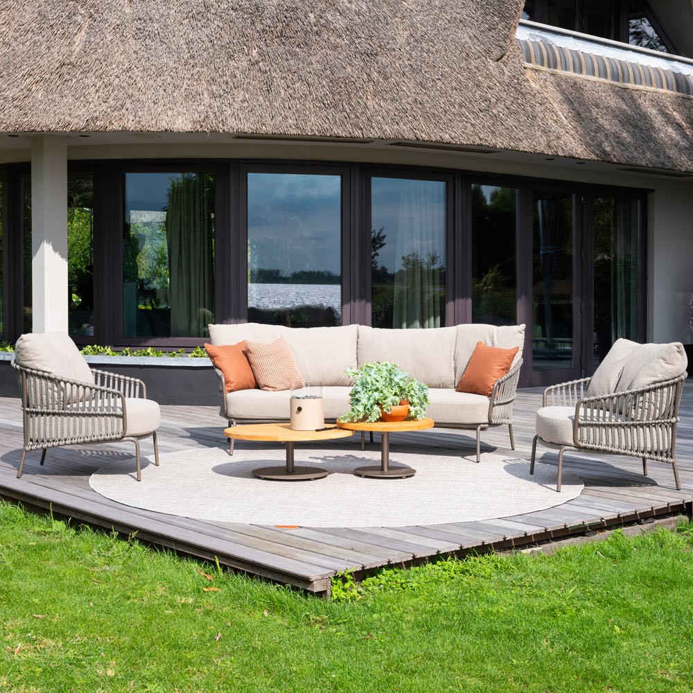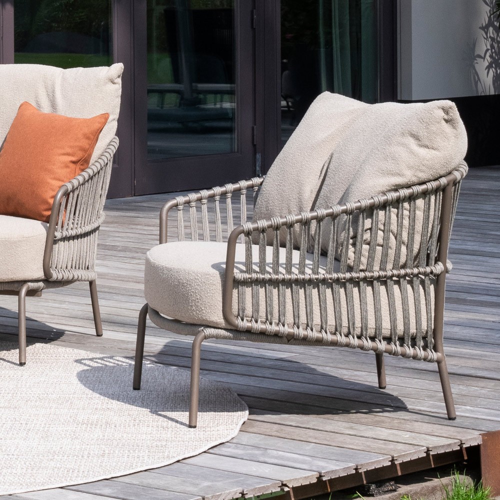 Avec son cadre en aluminium taupe et ses accoudoirs en corde tressée, le salon CORDELLA séduit par ses lignes douces et son style naturel et moderne. Les coussins généreux, habillés d’un tissu beige aux tons neutres, offrent une assise confortable et accueillante – parfaite pour se détendre en plein air.