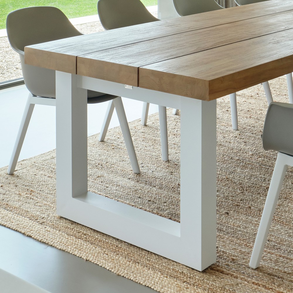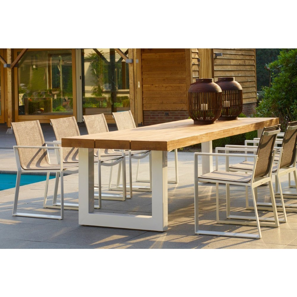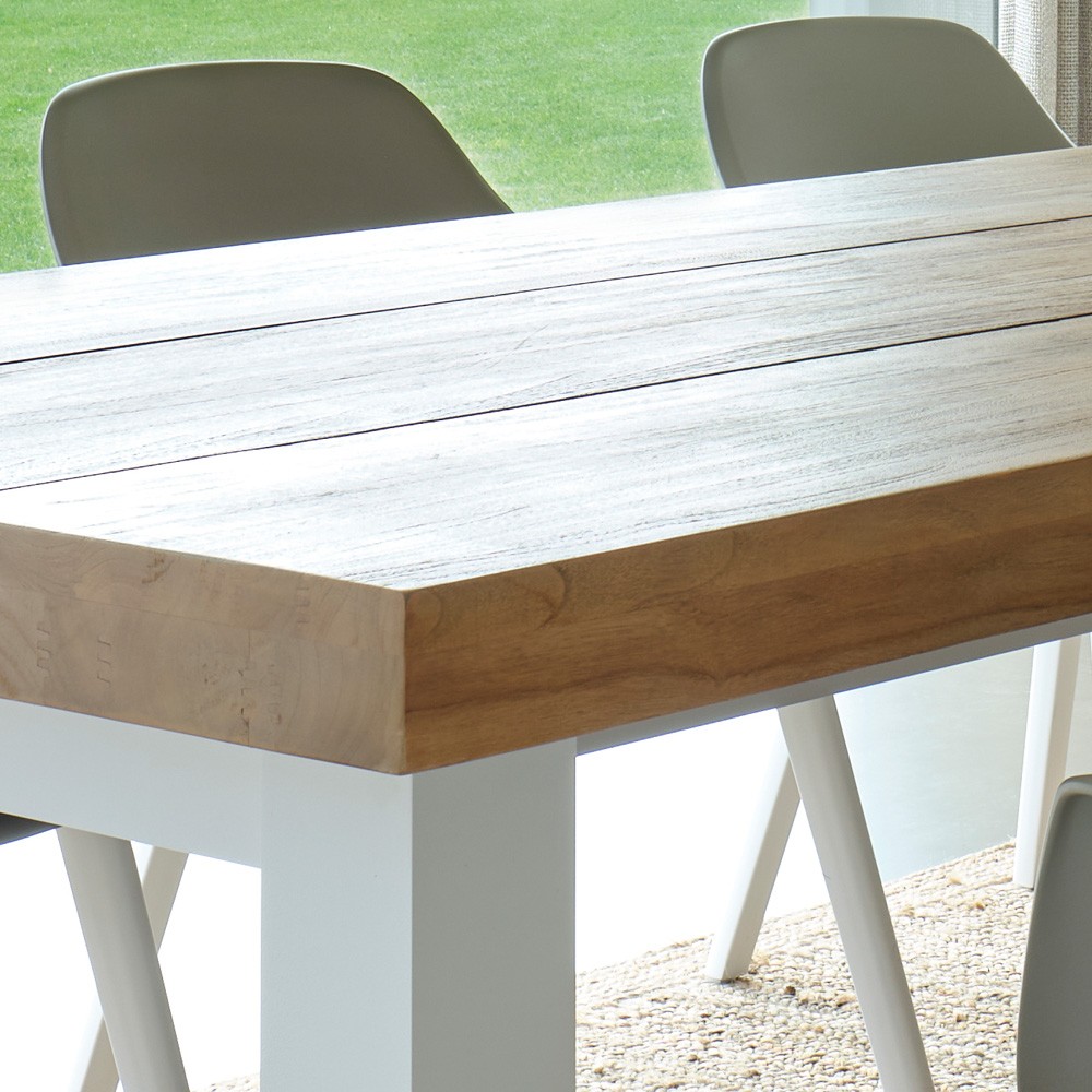 Belle et généreuse, la table de jardin Nevada est d’une élégance intemporelle. Dotée d’un cadre en aluminium blanc anthracite thermolaqué, et d’un imposant plateau en teck robuste d’une épaisseur de 8cm, elle sera la table de repas idéale pour des moments conviviaux en extérieur.