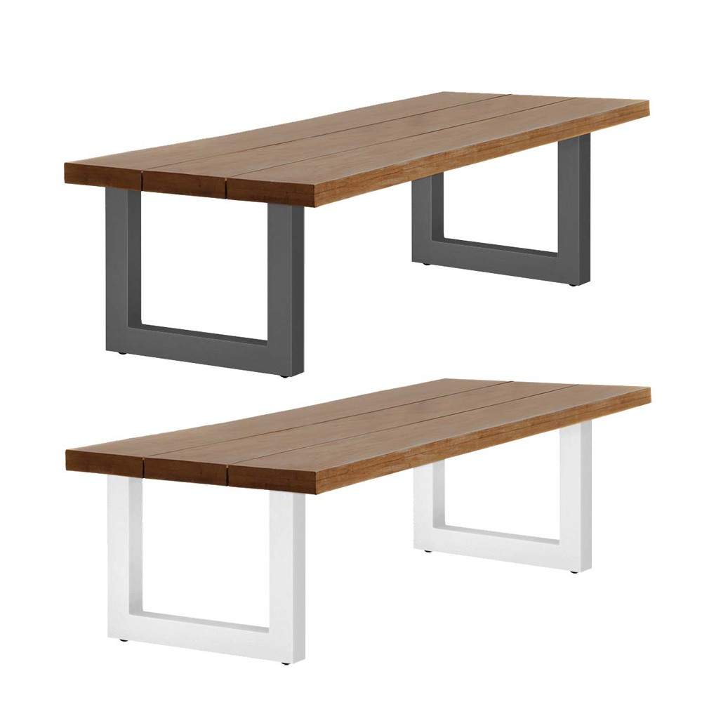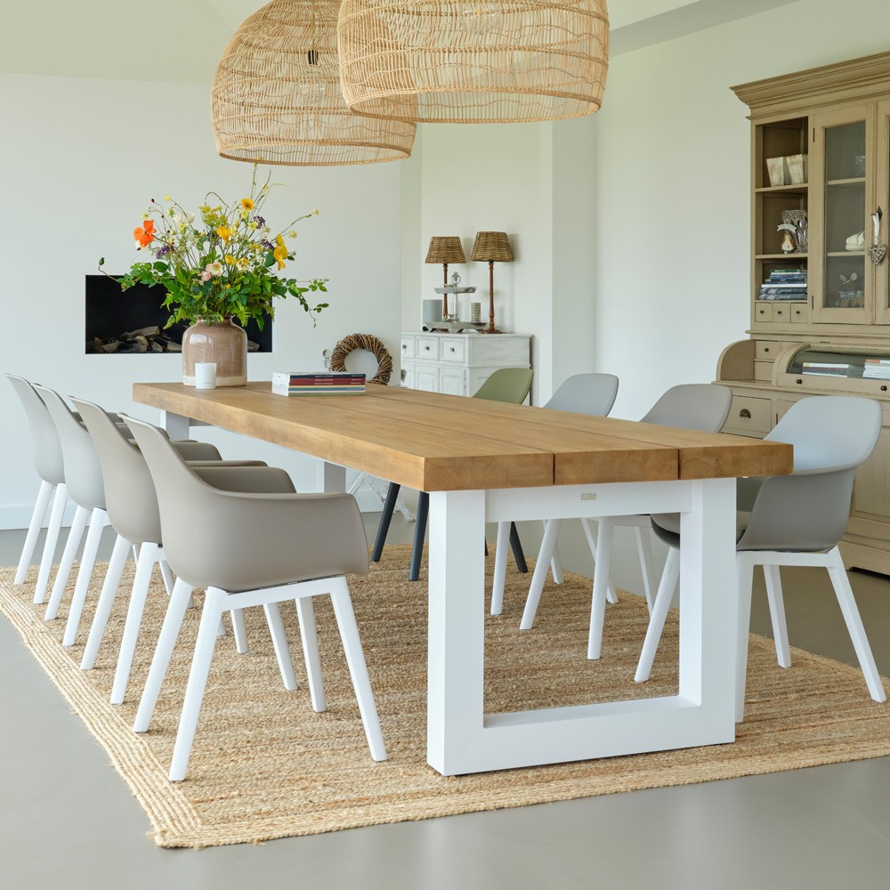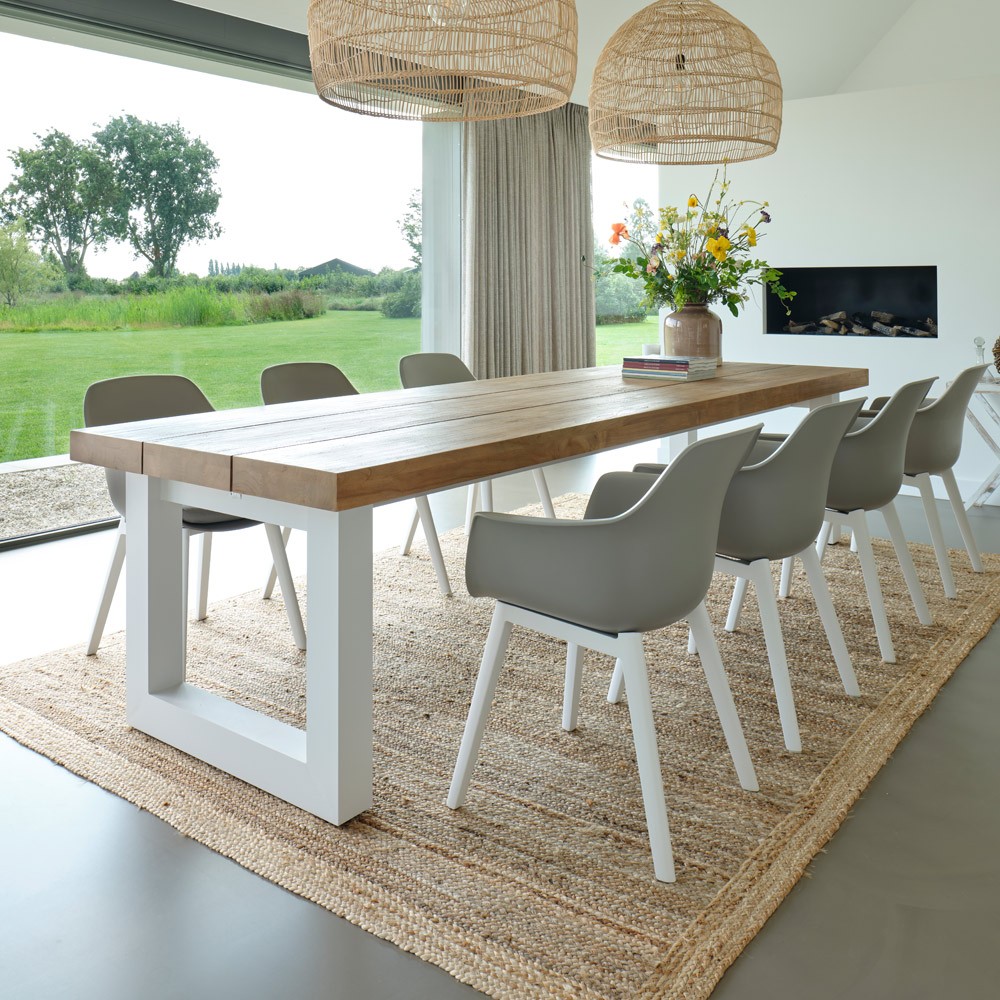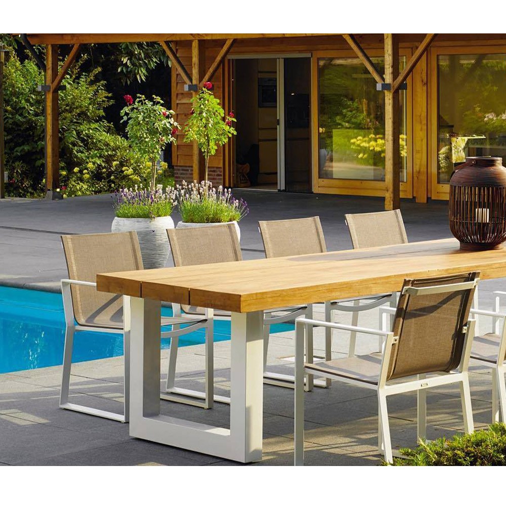 Belle et généreuse, la table de jardin Nevada est d’une élégance intemporelle. Dotée d’un cadre en aluminium blanc anthracite thermolaqué, et d’un imposant plateau en teck robuste d’une épaisseur de 8cm, elle sera la table de repas idéale pour des moments conviviaux en extérieur.
