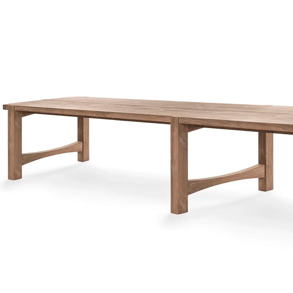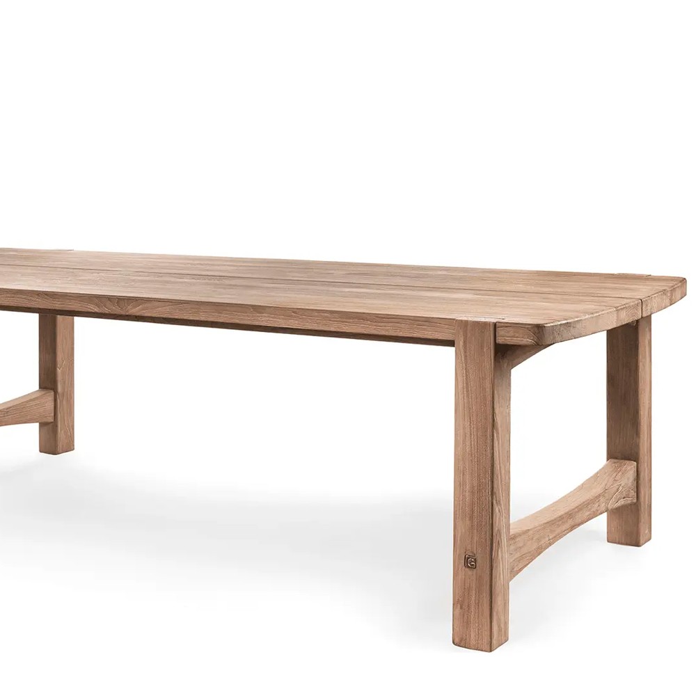 Ajoutez du charme à vos repas en extérieur grâce à la table JUNO. Avec ses 4,5 mètres de longueur, elle transforme chaque repas en un moment unique. Conçue pour les grandes tablées, elle invite au partage et à la convivialité, que ce soit pour des déjeuners ensoleillés dès les beaux jours ou des soirées estivales. Son plateau en teck recyclé, composé de larges planches aux nuances naturelles, raconte l’histoire d’un bois chargé d’authenticité.