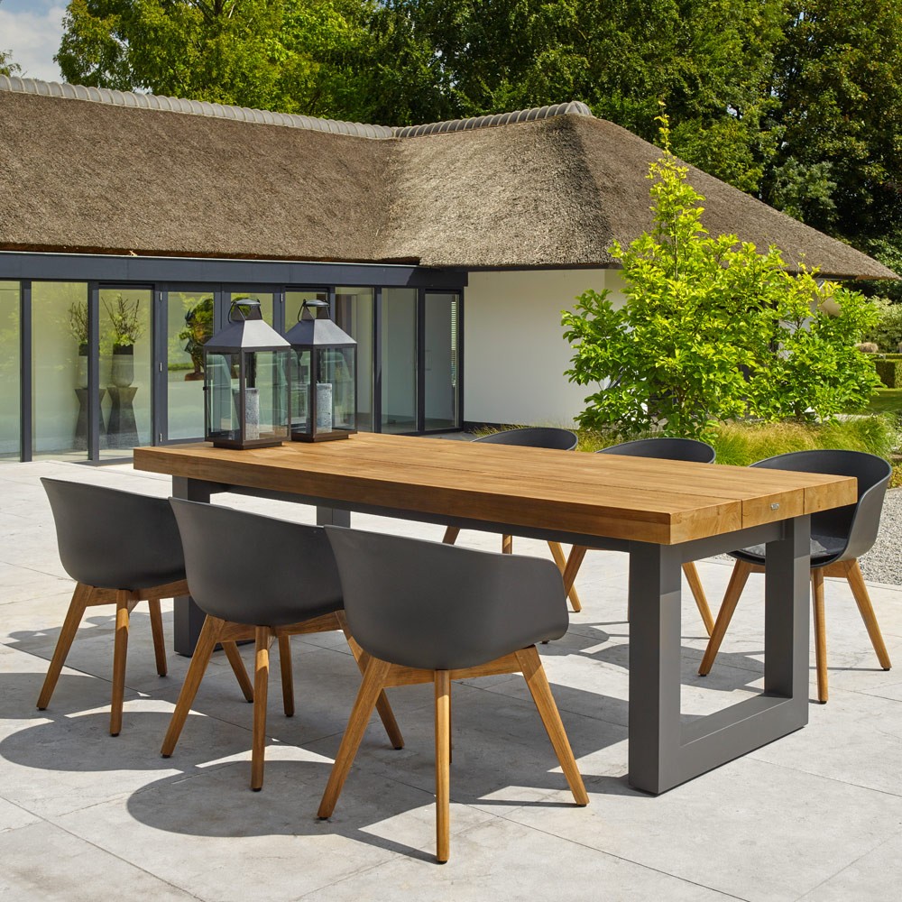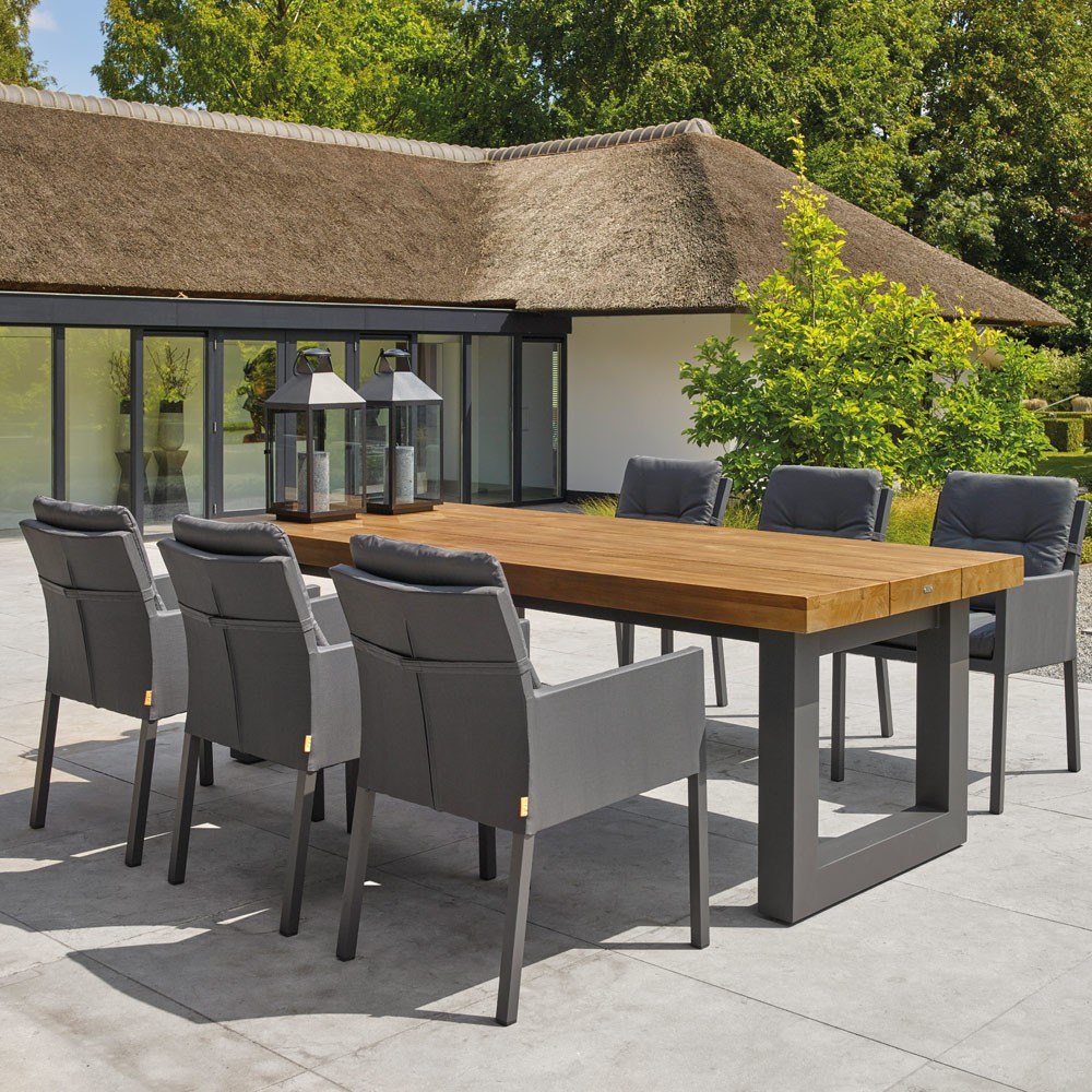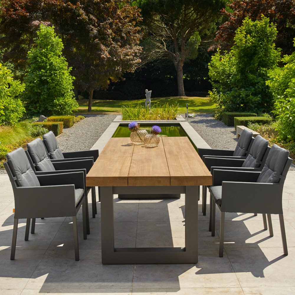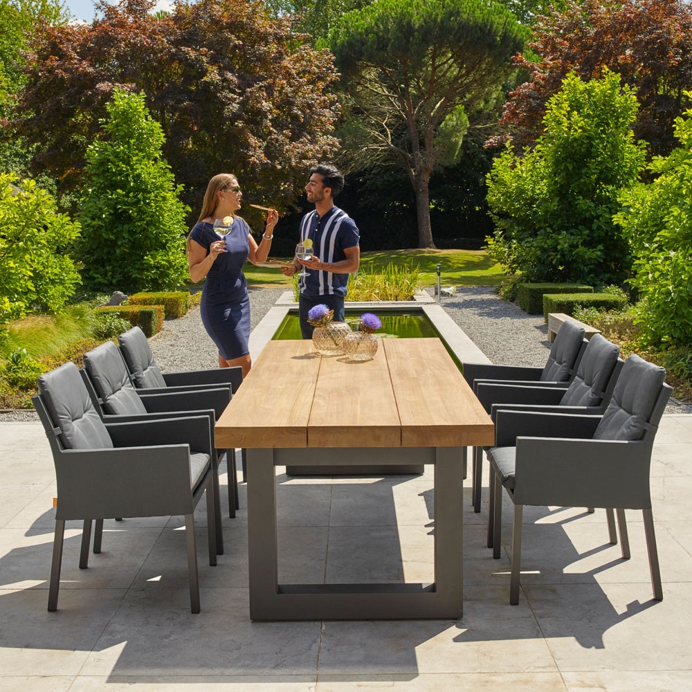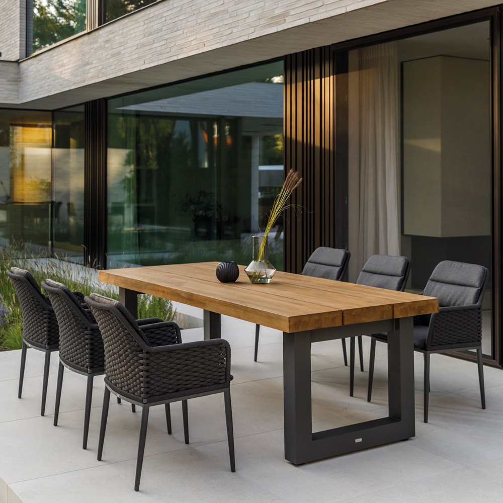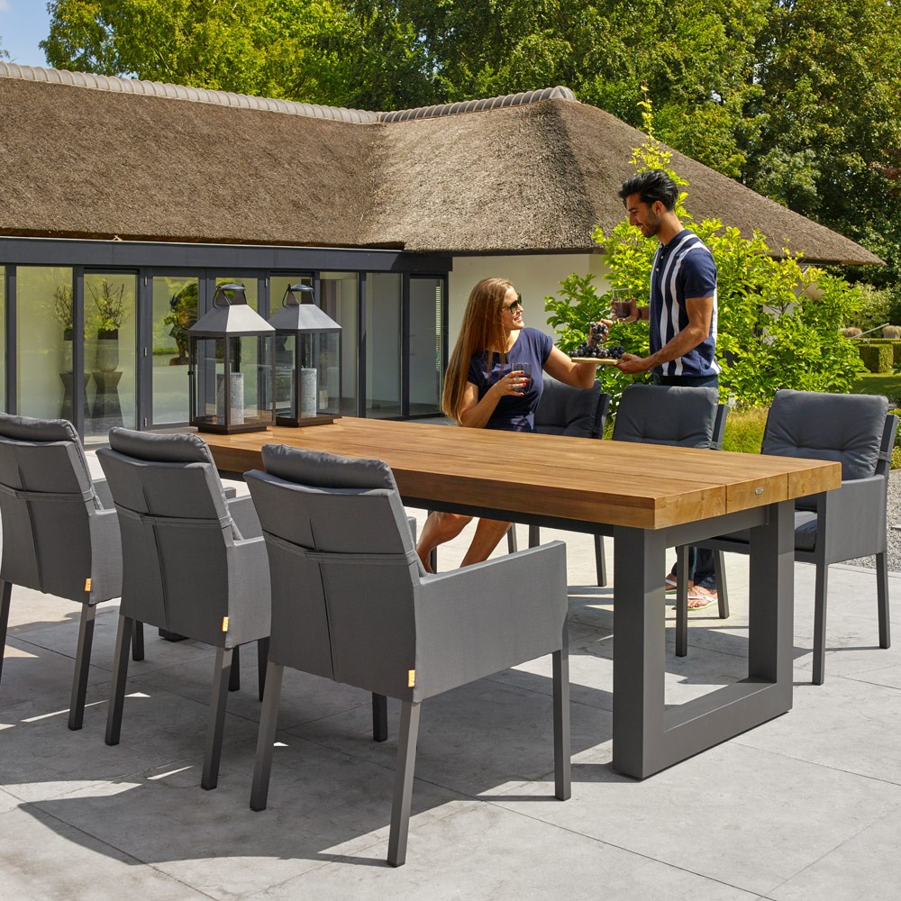 Belle et généreuse, la table de jardin Nevada est d’une élégance intemporelle. Dotée d’un cadre en aluminium gris anthracite thermolaqué, et d’un imposant plateau en teck robuste d’une épaisseur de 8cm, elle sera la table de repas parfaite pour des moments conviviaux en extérieur.